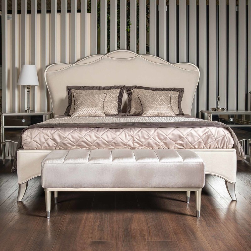 Лаконичная банкетка от итальянского бренда Fratelli Barri выполнена в стиле неоклассика. Является прекрасным дополнением к кровати или как самостоятельный предмет интерьера. На ножках металлические колпачки. Каркас банкетки выполнен из натурального массива дерева. Отделка ножек - лак, цвет - патинированное серебро. Сиденье обито тканью в серебристых тонах и декорировано стежкой. Тип ткани - велюр. Состав ткани - 100% terylene. Цвет фурнитуры - хром.