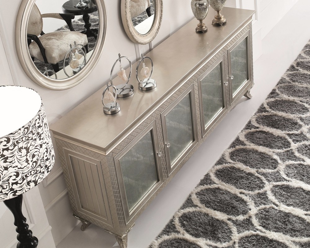 Буфет Flopence от итальянского бренда Fratelli Barri выполнен в стиле близком к классическому. Увеличенные размеры буфета делает его отдельным арт-объектом, притягивающим все взгляды. Серебряная отделка придает мебели этой коллекции особенную привлекательность. Акцентные ручки хрусталики. Рама декорирована геометрической разметкой. Прямые детали корпуса выполнены из МДФ класса Е1. Ножки - из массива дерева. Отделка серебряное напыление, покрытое лаком. Окрашивание и декорирование витрины делается вручную. 4 распашные дверки. Фасады - окрашенное в серебро стекло. За каждой дверкой - 2 полки и ящик внизу. Ящики снабжены направляющими. Внутри отделка белого цвета.