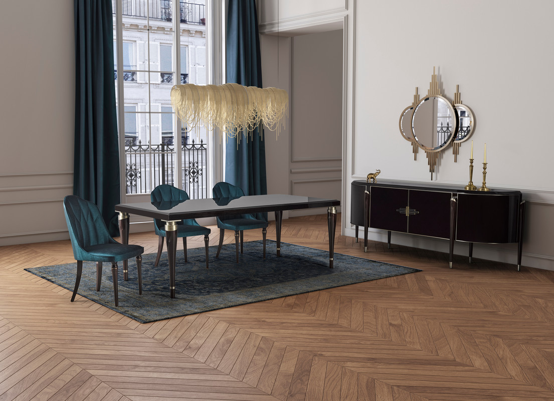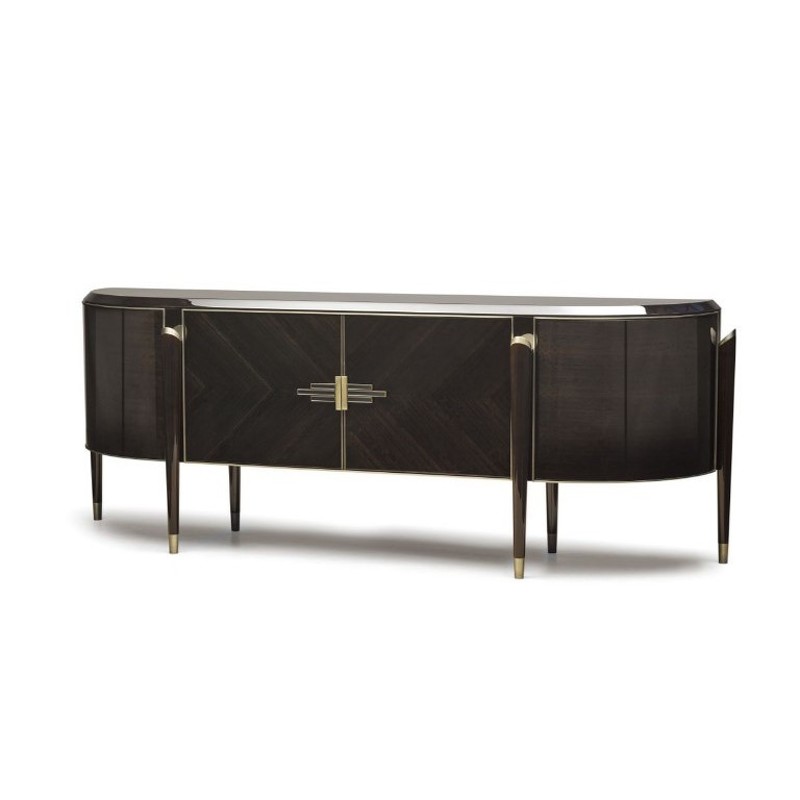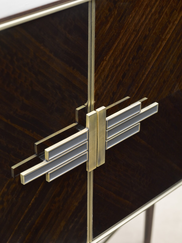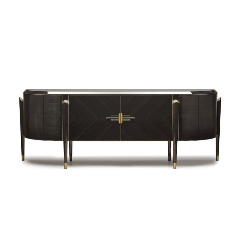 Буфет с распашными дверками выполнен в стиле Ар-деко. Буфет изготовлен из высококачественного шпонированного МДФ высокой плотности. Детали из нержавеющей стали с латунным покрытием.
