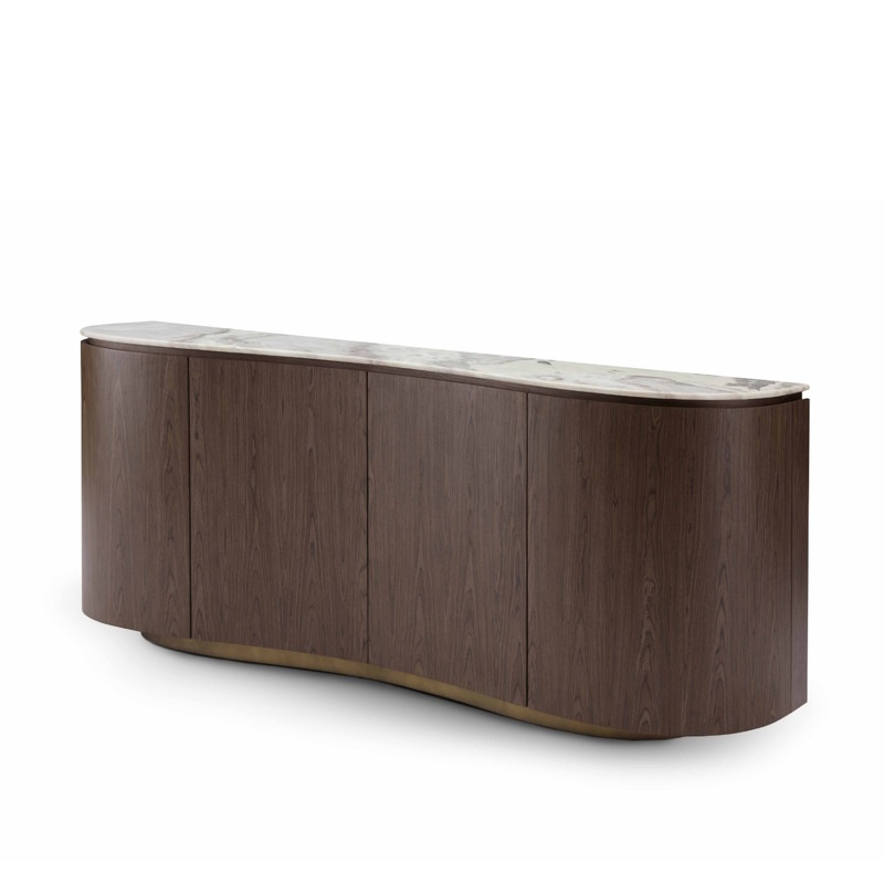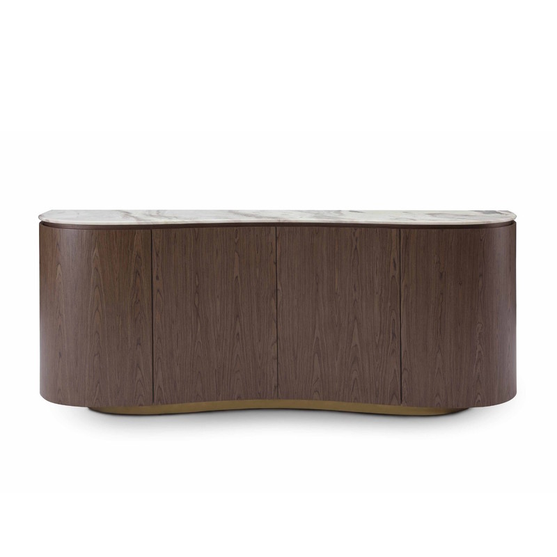 Буфет в современном стиле от Fratelli Barri - необычная форма в сочетании с благородными материалами. Буфет изготовлен из высококачественного МДФ. Столешница - белый матовый мрамор Dover, отделка корпуса - матовый шпон вяза, металлический цоколь в цвете латунь. Буфет оснащен четырьмя распашными дверцами, что позволяет организовать удобное и доступное хранение без визуального шума.