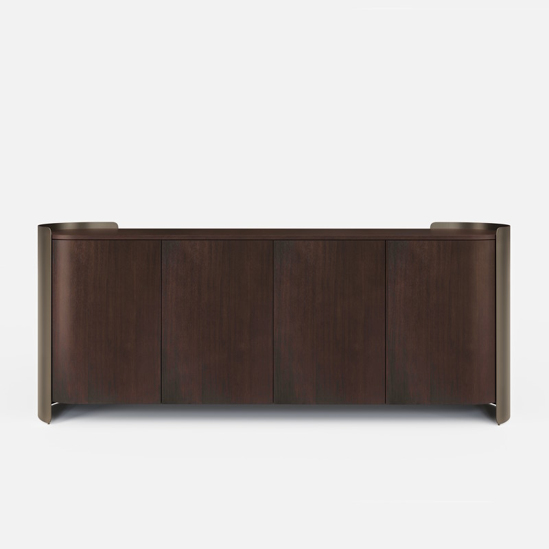 Буфет от бренда Fratelli Barri. Оснащен четырьмя распашными дверцами с полками, где можно комфортно разместить столовые предметы или другие вещи. Отделка корпуса и столешницы буфета - дымчатый шпон ореха, декоративная изогнутая часть в цвете матовая латунь W2303.