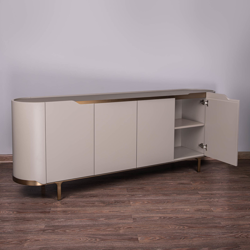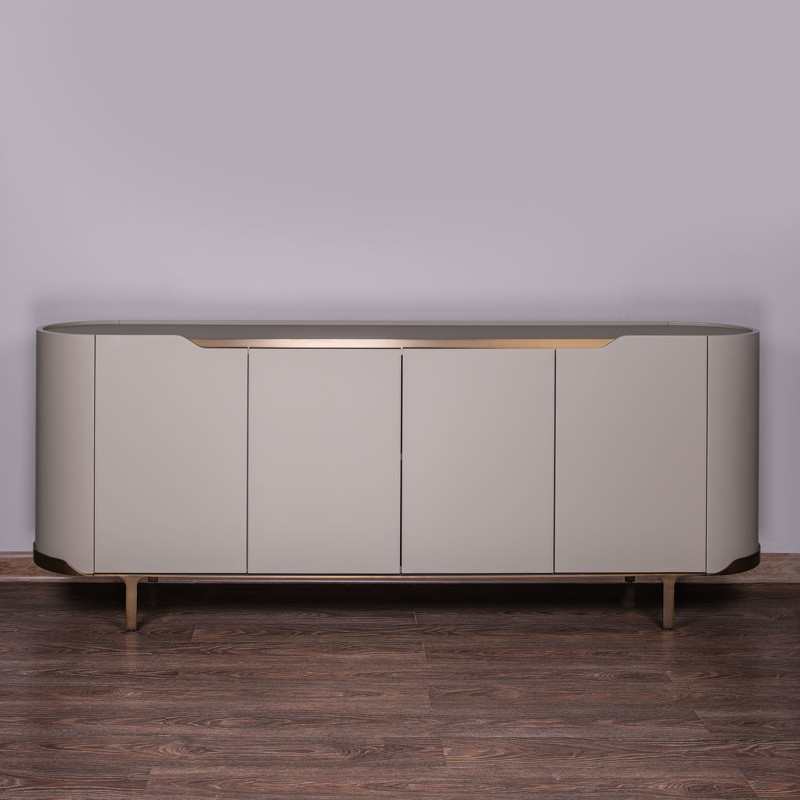 Буфет в современном стиле от итальянского бренда Fratelli Barri - стильный и функциональный предмет мебели для современной столовой или гостиной. Буфет оснащен четырьмя распашными дверцами, что позволяет организовать удобное хранение без визуального шума. Дверцы оснащены плавным закрытием "soft close". Буфет выполнен из высококачественного МДФ высокой плотности. Столешница в отделке из матового стекла. Декоративные элементы и ножки из нержавеющей стали в цвете бронза.