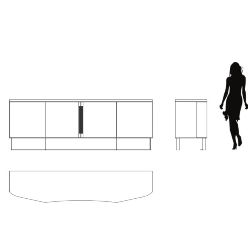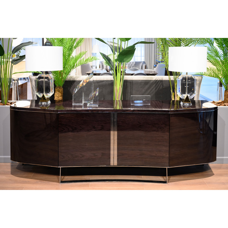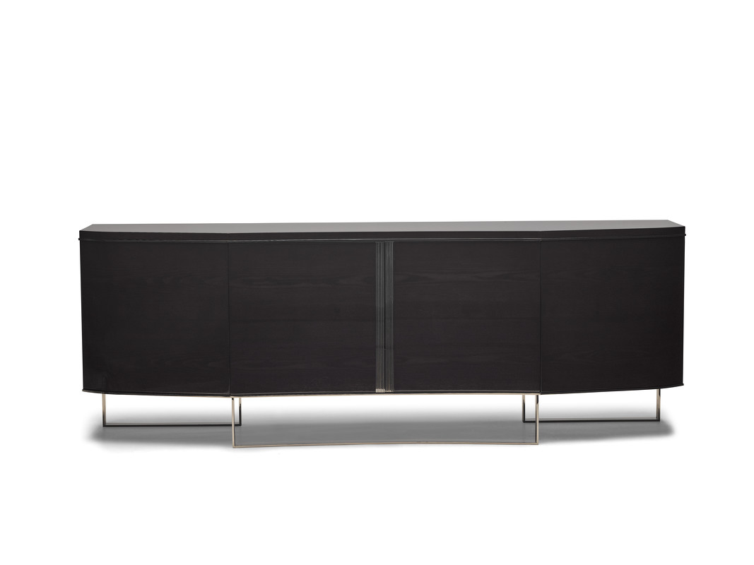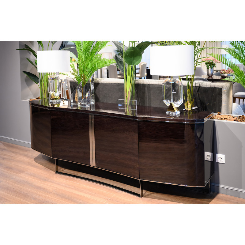 Буфет выполнен в стиле Ар-деко. Изготовлен из высококачественного шпонированного МДФ, ножки из полированной стали в отделке дымчатый хром. Буфет оснащен четырьмя распашными дверками, внутри деревянные полки по одной в каждой секции и выдвижной ящик. Дверки буфета открываются на 180 градусов.
