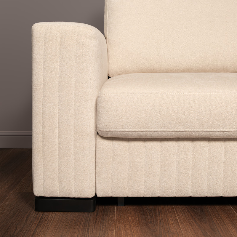 Диван-кровать Marriotto от бренда Fratelli Barri, утонченное сочетание современного стиля и функционала. Каркас дивана-кровати изготовлен из металла и МДФ. Основание сиденья (пума): металлические пружины-змейка, блок независимых пружин. Опоры: массив бука. Сиденье выполнено из высокоэластичного ППУ марки HR3020, плотностью 30 кг/м3. Дополнительно обернуты высокообъёмным материалом "холотек", плотностью 200 г/м2. Подлокотники и царга: эластичный ППУ плотностью 25 и 22 кг/м3. Дополнительно обернуты "холотеком", плотностью 100 г/м2. Подушки "пух-перо" дополнительно обернуты "холотеком" плотностью 200 г/м2. Подушки имеют внутренние перегородки, уменьшающие миграцию наполнителя. Механизм диван-кровати "Пума" с независимым пружинным блоком. Механизм открывания ёмкостей для хранения в угловых диванах (в кресельных модулях) изготовлен из металла. Для улучшения функции открывания ёмкостей, во все механизмы установлены газовые амортизаторы. Размер спального места 150*200 см. Ткань обивки из коллекции Koma – плотная и фактурная из петельчатых ворсинок, идеально подходит для обивки диванных групп, кроватей и подушек. Тип ткани: букле. Состав ткани: 100% полиэстер. Плотность: 650 гр/м2. Устойчивость к истиранию: 50000 циклов.