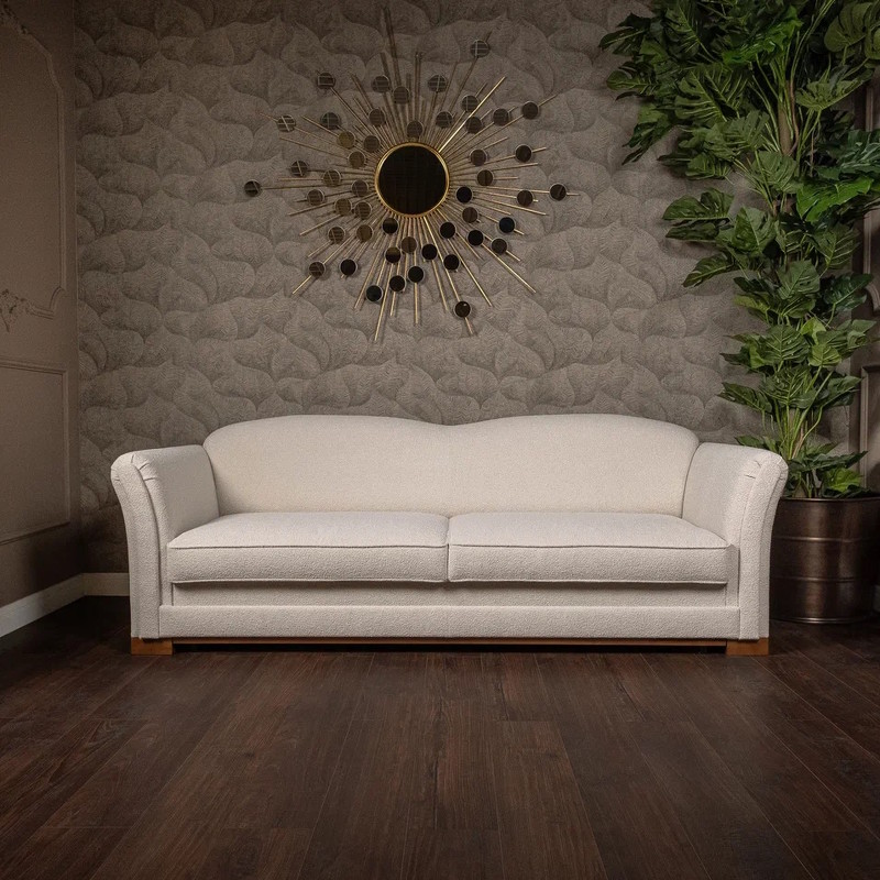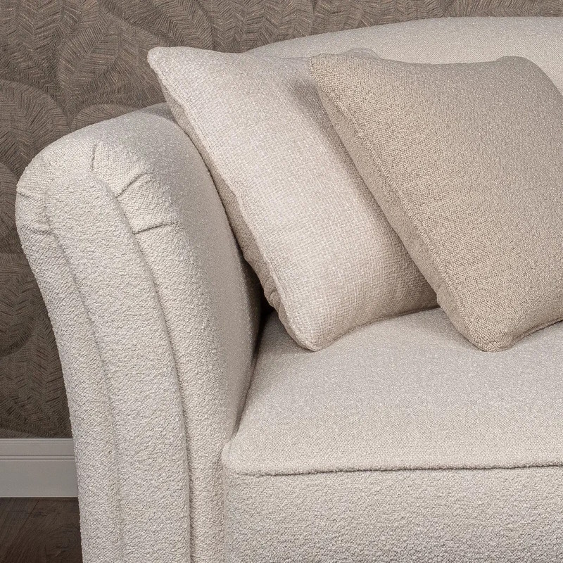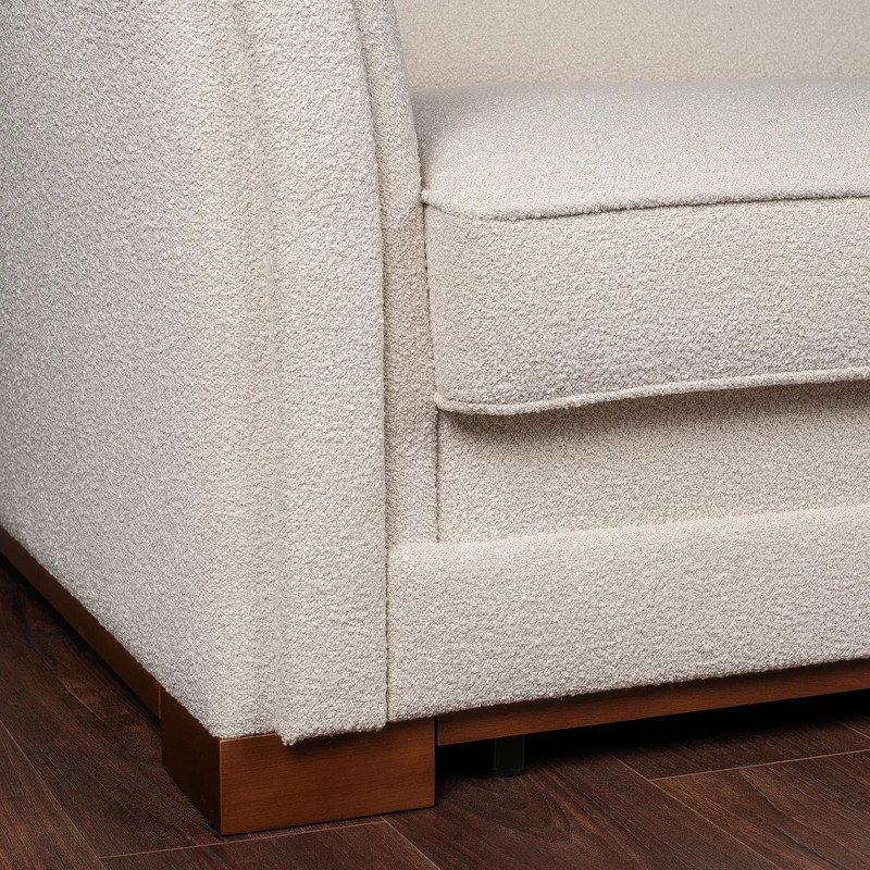 Каркас дивана-кровати изготовлен из металла и МДФ. Наполнитель подлокотников и царги: эластичный ППУ плотностью 25 и 22 кг/м3 и дополнительно обернут холотеком плотностью 100г/м2. Cидение: блок независимых металлических пружин-змейка и ППУ плотностью 30 кг/м3. Дополнительно обернуты высокообъемным материалом "Холотек", плотностью 200 г/м2. Обивка - ткань букле в светло-бежевых, почти белых тонах. Ткань из коллекции Loop фактурная, отлично ложится на любые формы мебели. Данный обивочный материал имеет отличные показатели по износоустойчивости и плотности. Тип ткани: Букле. Устойчивость к истиранию: >100000 циклов. Состав ткани: Полиэстер - 100%. Рекомендации по уходу: Сухая уборка пылесосом с мягкой щеткой; Влажная уборка микрофиброй; Не использовать отбеливатель; Не использовать абразивные средства. Наполнитель подушек материалом типа "холофайбер", скатанным в шарики, и, дополнительно, обернуты "холотеком" плотностью 200 г/м2. Подушки имеют внутренние перегородки, уменьшающие миграцию наполнителя. Механизм диван-кровати "Пума" с независимым блоком пружин. Декоративные подушки в стоимость не входят.
