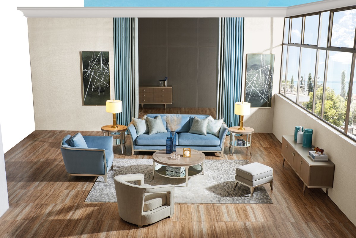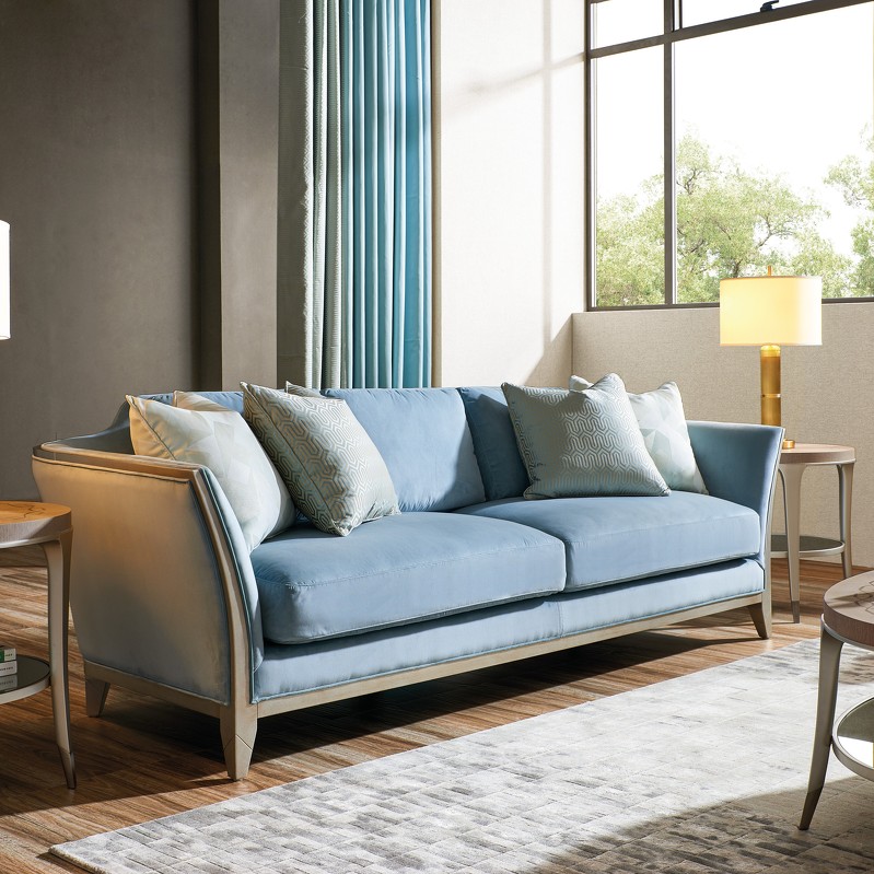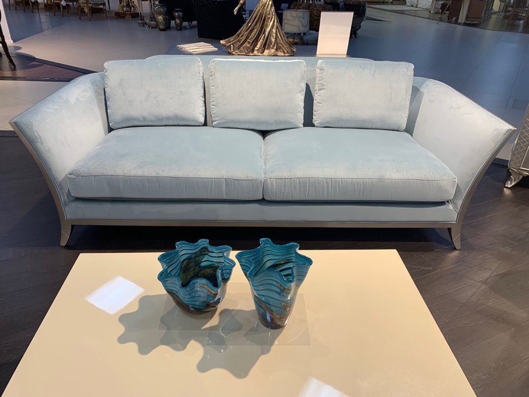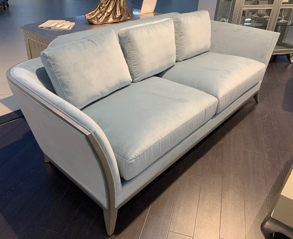 Трехместный диван Modena итальянского бренда Fratelli Barri на низких ножках выполнен в стиле неоклассика. Отделка - патинированное серебро. Обтянут тканью, декорирован кантом в тон основной обивки. Высокие, слегка наклоненные подлокотники подчеркивают оригинальность модели. Выполнен из массива дерева. Обит тканью из ассортимента фабрики в голубых тонах. Тип ткани - велюр. Состав ткани - 100% полиэстер. Подушки спинки размером 50*60 см. Декоративные подушки в стоимость не входят.