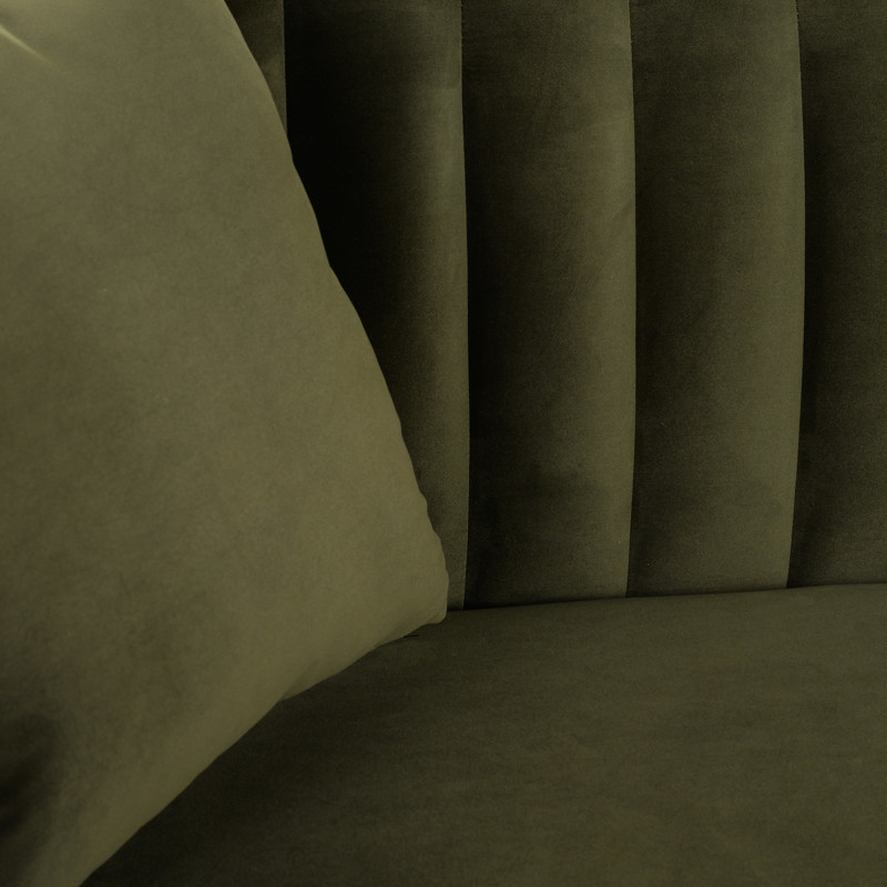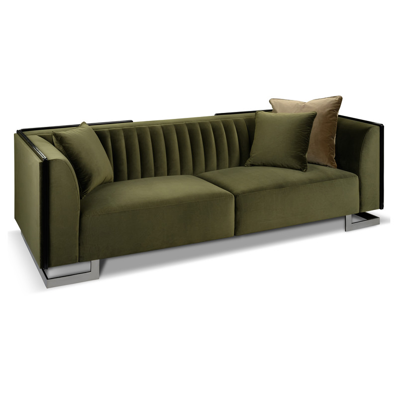 Диван 3 местный выполнен в стиле Ар-деко. Спинка дивана декорирована вертикальной стежкой. Каркас изготовлен из массива бука. Сидение на эластичных ремнях, наполнитель пенополиуретан. Ножки металл. В комплектацию входит две декоративные подушки размером 50*50 см и одна подушка 60*60 см.