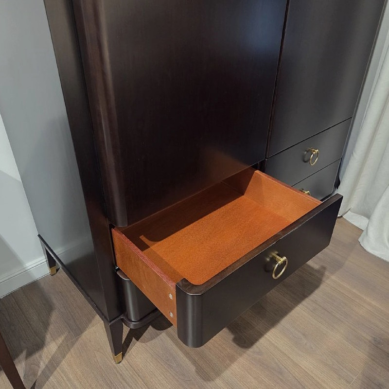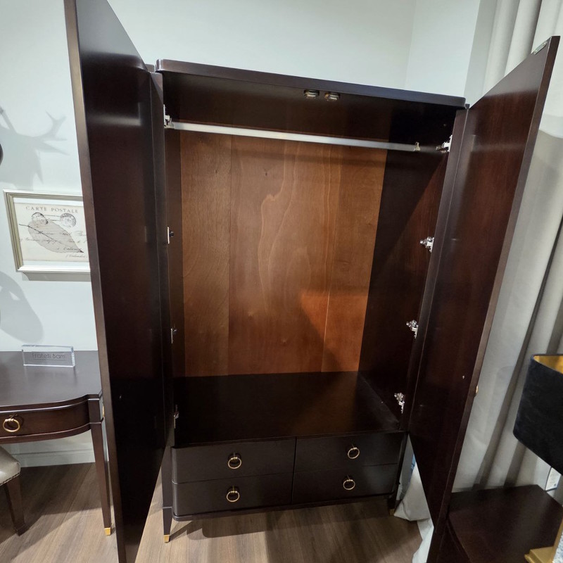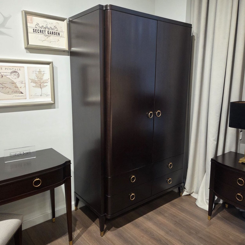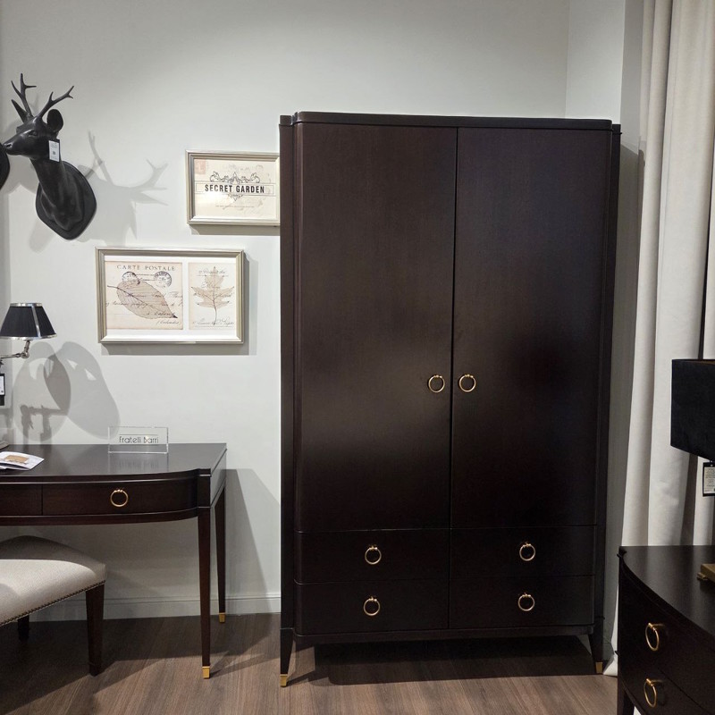 Изящный гардероб Modena от итальянского бренда Fratelli Barri. Гардероб в неоклассическом стиле, с 2-мя распашными дверками и 4-мя выдвижными ящиками. Закругленные фасады. Отделка - шпон вишни. На ножках металлические колпачки. Выполнен из массива дерева и высококачественного МДФ класса Е1. Цвет фурнитуры - латунь. Ящики оснащены доводчиками для плавного закрывания. За дверками единое отделение со штангой.