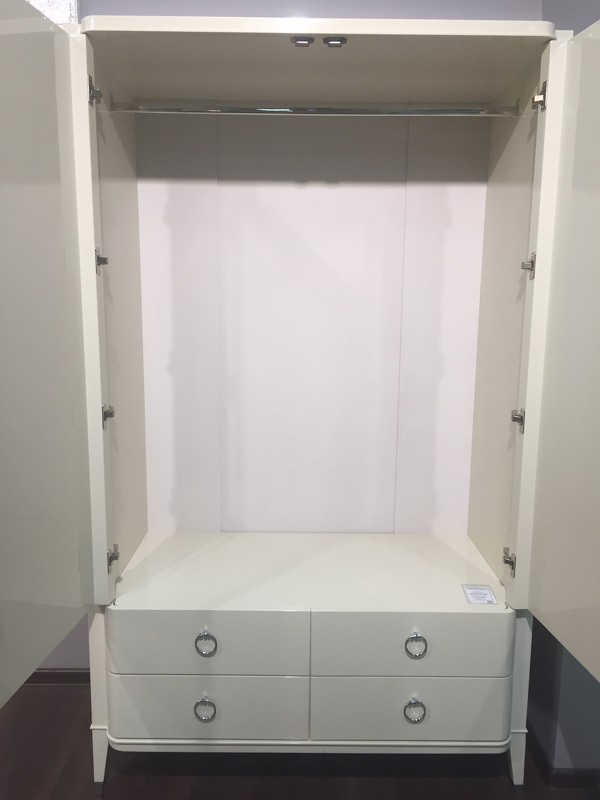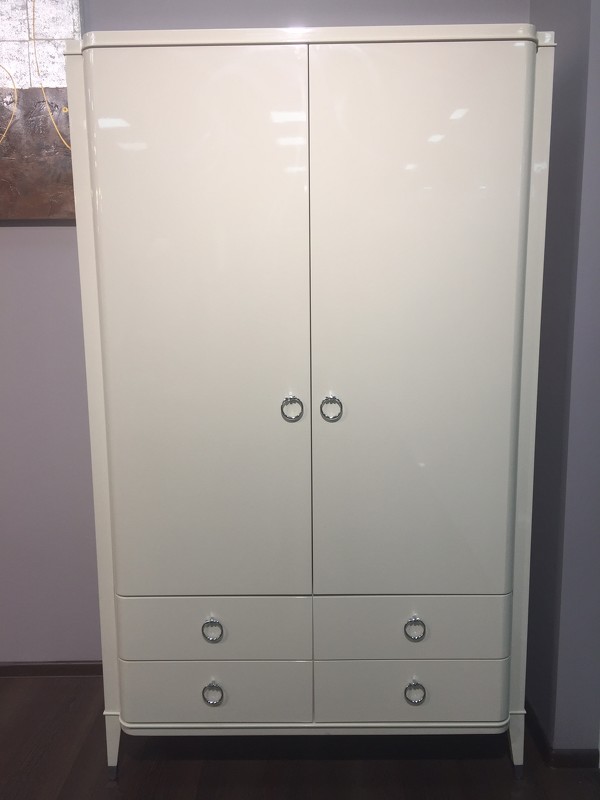 Изящный гардероб Modena от итальянского бренда Fratelli Barri. Гардероб в неоклассическом стиле, с 2-мя распашными дверками и 4-мя выдвижными ящиками. Закругленные фасады. Выполнен в отделке глянцевым лаком, на ножках металлические колпачки. Гардероб изготовлен из массива дерева и высококачественного МДФ класса Е1. Ящики оснащены доводчиками для плавного закрывания. За дверками единое отделение со штангой.