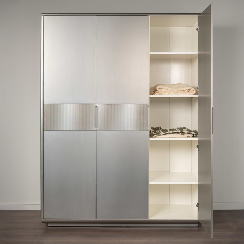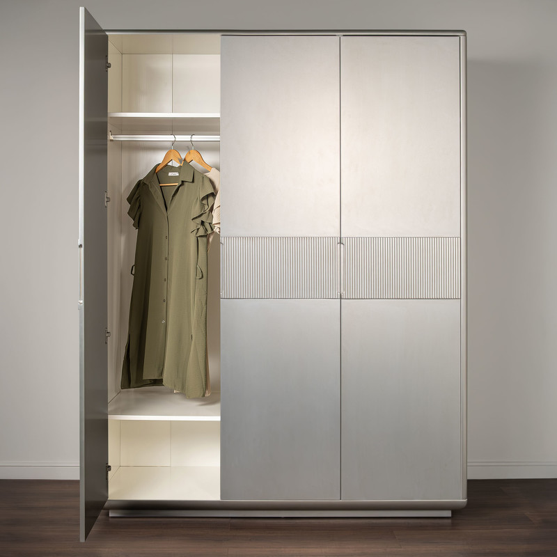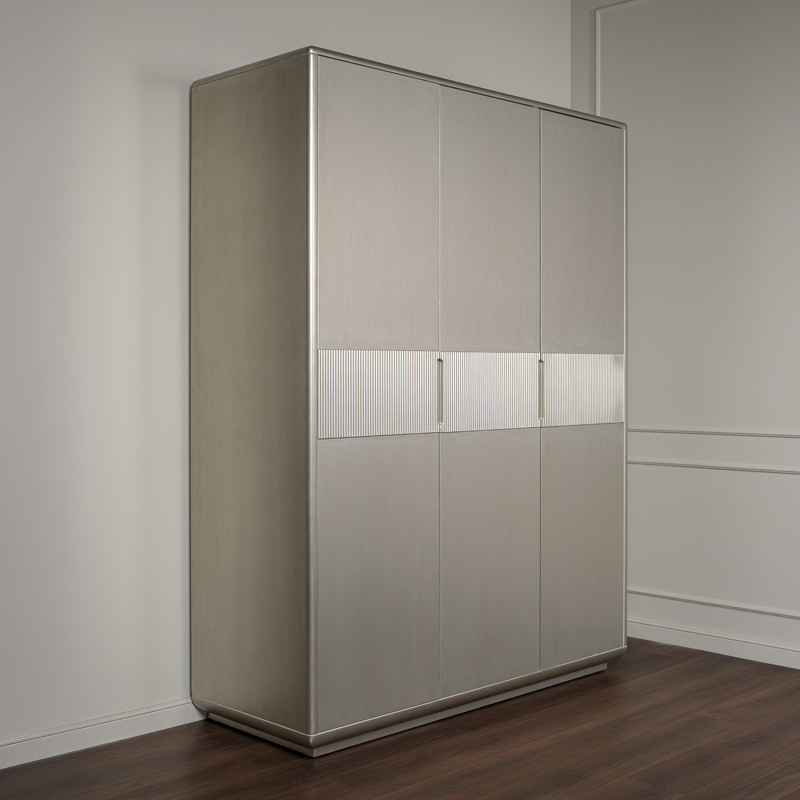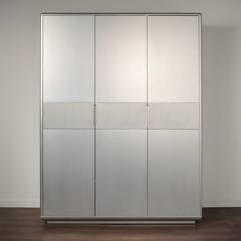 Гардероб Rimini от итальянского бренда Fratelli Barri с 3 распашными дверцами в лаконичном дизайне. Выполнен из высококачественного МДФ. Отделка - лак, цвет - патинированное серебро. Внутри отделка белого цвета. Ручка-выемка на фасаде. Рифленые вставки на фасадах. Внутреннее наполнение: слева широкое отделение с 2-мя полками и штангой, 4 полки в модуле справа. Данный предмет является частью коллекции для спальни. В коллекции представлены кровать, тумбочки и комод в аналогичном дизайне и отделке.