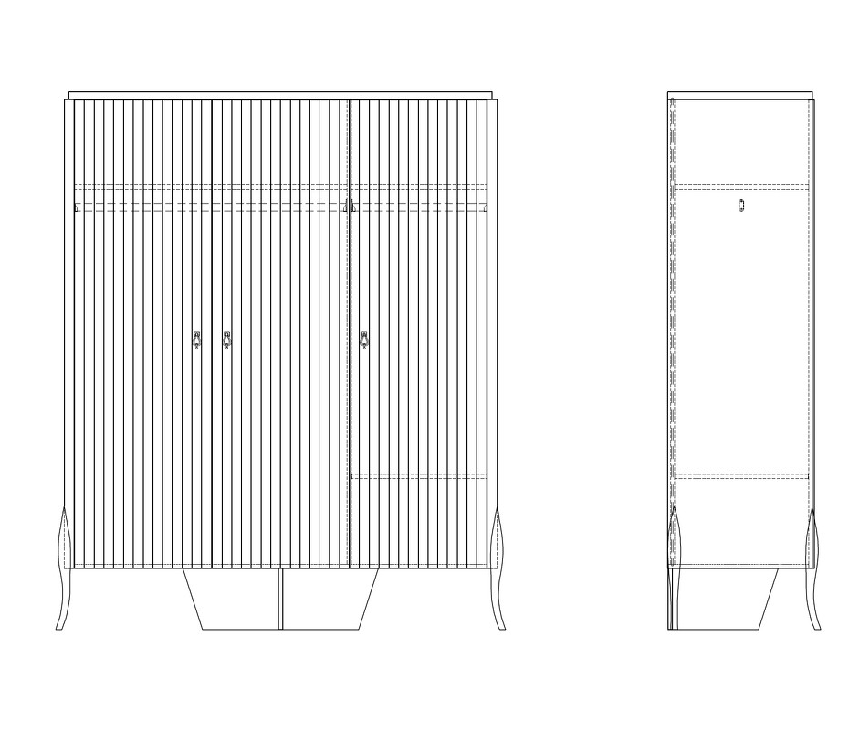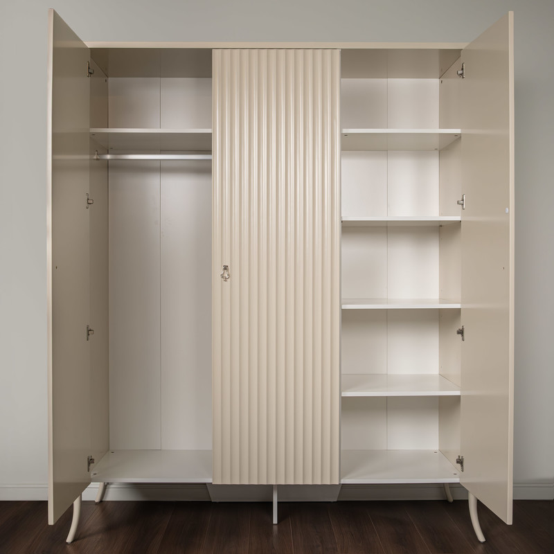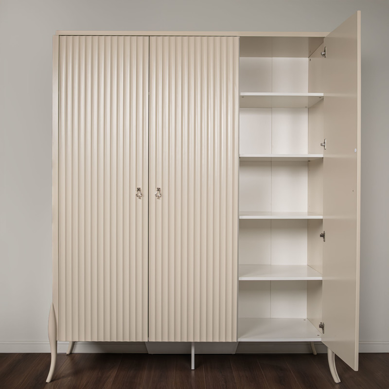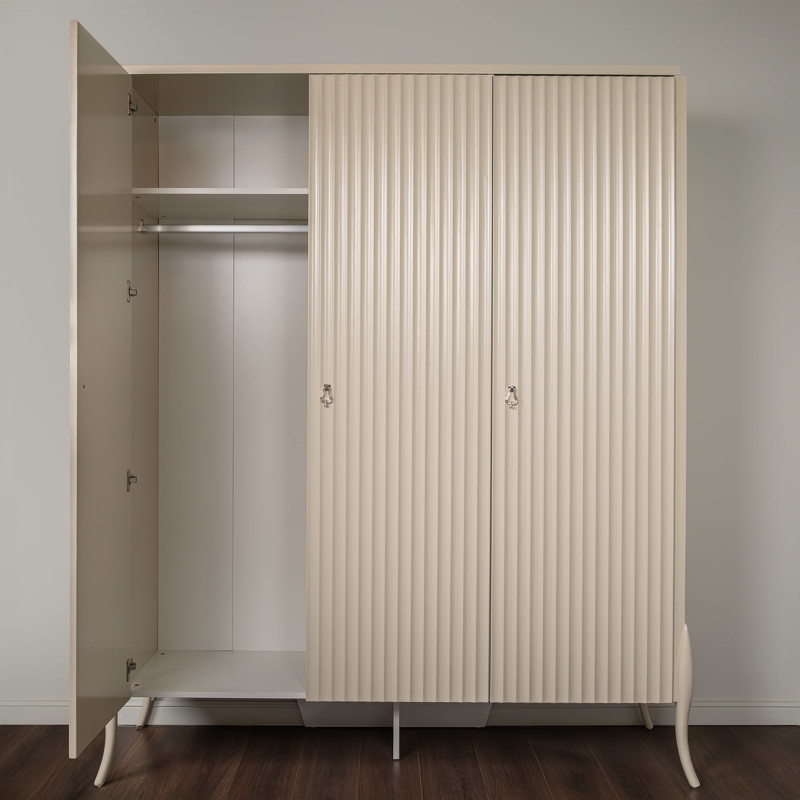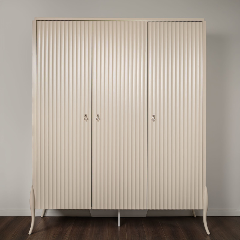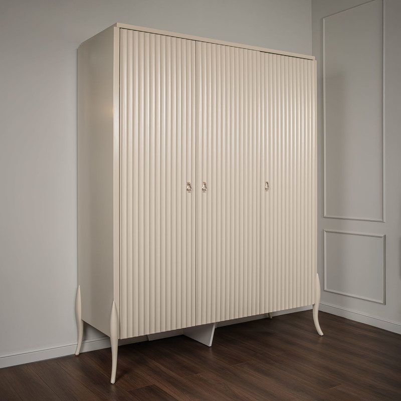 Гардероб с 3 распашными дверцами от итальянского бренда Fratelli Barri в стиле неоклассика. Дизайн с рифлеными фасадами — отсылка к основному тренду в дизайне итальянской мебели в сезоне 2024/2025! Выполнен из массива дерева и высококачественного МДФ. Отделка - бежевый матовый лак. Внутри отделка белого цвета. Цвет фурнитуры - серебро. Внутреннее наполнение: слева широкое отделение с 2-мя полками и штангой, 4 полки в модуле справа. Данный предмет является частью коллекции для спальни. В коллекции представлены кровать, тумбочки и комод в аналогичном дизайне и отделке.