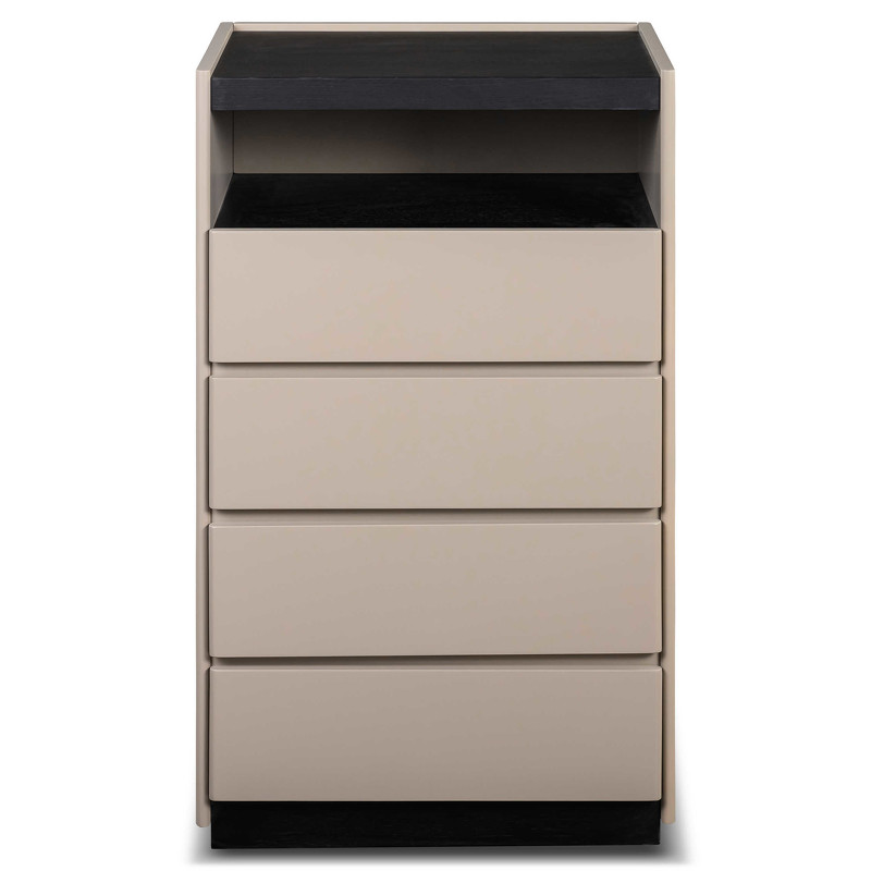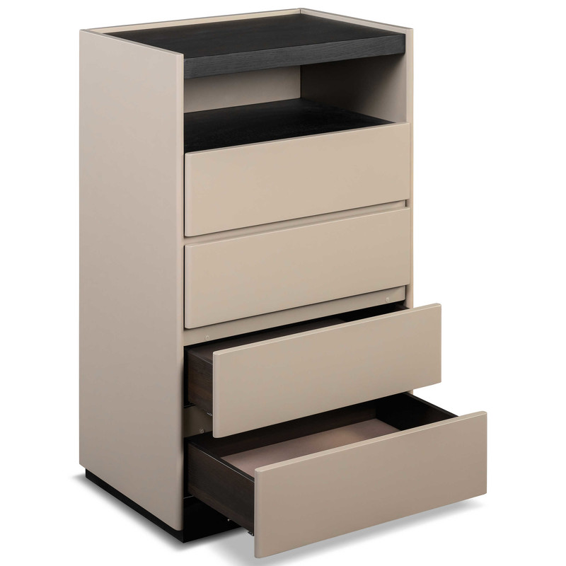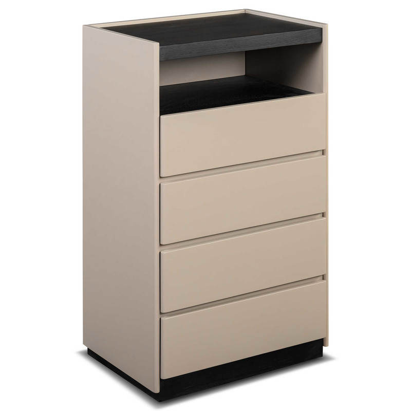 Высокий комод с 4 ящиками от итальянского бренда Fratelli Barri. Плавное закрывание ящиков благодаря системе soft-closing. Столешница в отделке натуральным шпоном дымчатого дуба, а фасады — в отделке бежевым матовым лаком. Данный предмет — часть новой коллекции Concept от Fratelli Barri, включающей всю корпусную мебель для спальни, гостиной и столовой. Вы можете оформить интерьер вашей квартиры или дома в едином стиле.