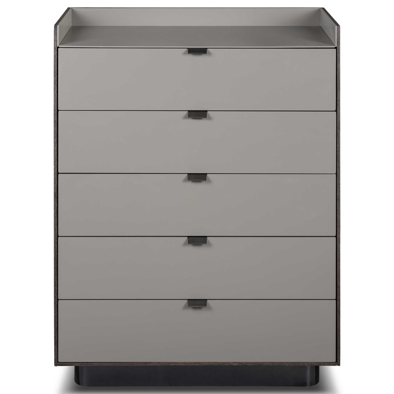 Комод от итальянского бренда Fratelli Barri. Модель изготовлена из высококачественной МДФ. Боковины в отделке шпоном дымчатого дуба, фасады ящиков в отделке матовым лаком. Модель оснащена 5 выдвижными ящиками с механизмом открывания soft-closing. Данный предмет — часть новой коллекции Concept от Fratelli Barri, включающей всю корпусную мебель для спальни, гостиной и столовой. Вы можете оформить интерьер вашей квартиры или дома в едином стиле.