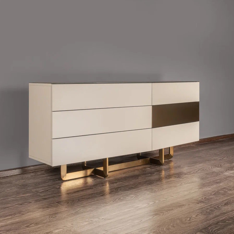 Комод от итальянского бренда Fratelli Barri оснащен шестью выдвижными ящиками, благодаря которым можно разместить все необходимое, обеспечивая удобное и доступное хранение. Ящики оснащены механизмом "push to open". Комод изготовлен из высококачественного МДФ, корпус выполнен в отделке матовым серо-бежевым лаком, ножки и фасад одного ящика выполнены из металла в цвете бронза WJ-09. Столешница выполнена из стекла.