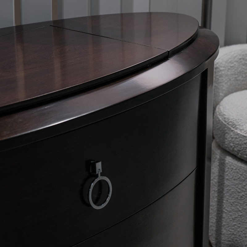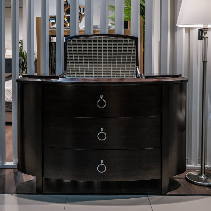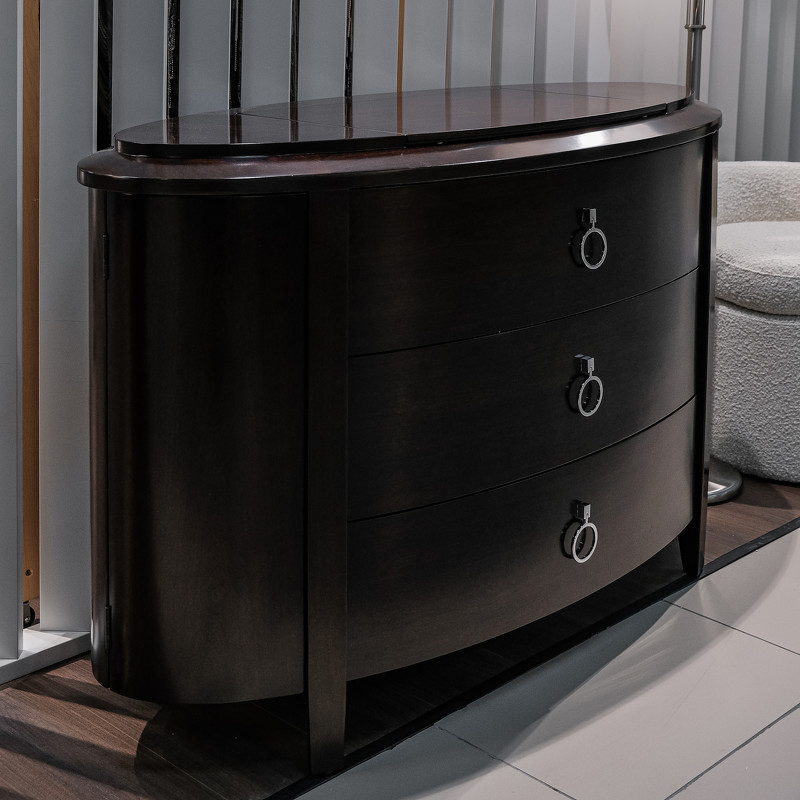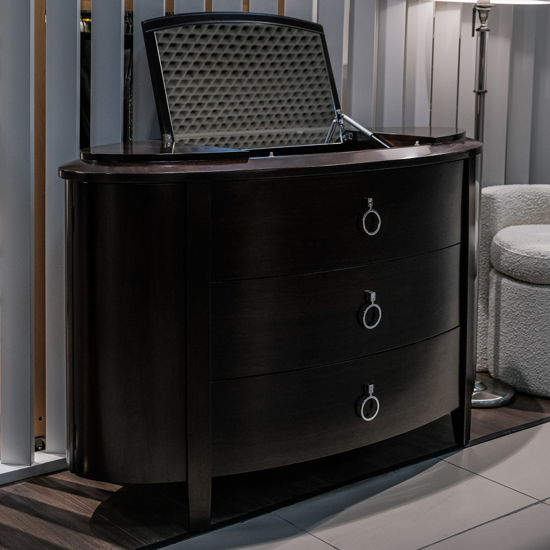 Шикарный комод с 3 ящиками в стиле неоклассика от итальянского бренда Fratelli Barri. В столешницу встроено зеркало с подъемным механизмом — для будуарного отсека для украшений. Каркас — массив дерева и высококачественная МДФ высокой плотности, отделка — натуральный шпон вишни. Все выдвижные ящики снабжены направляющими. Модель принадлежит к коллекции мебели Mestre в стиле неоклассика от Fratelli Barri. Здесь вы можете найти мебель для гостиной, столовой и спальни: сотни вариантов доступны для комбинации друг с другом.