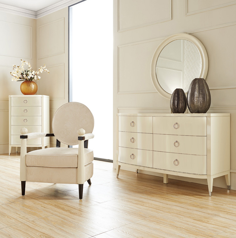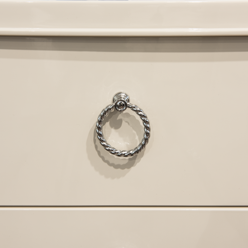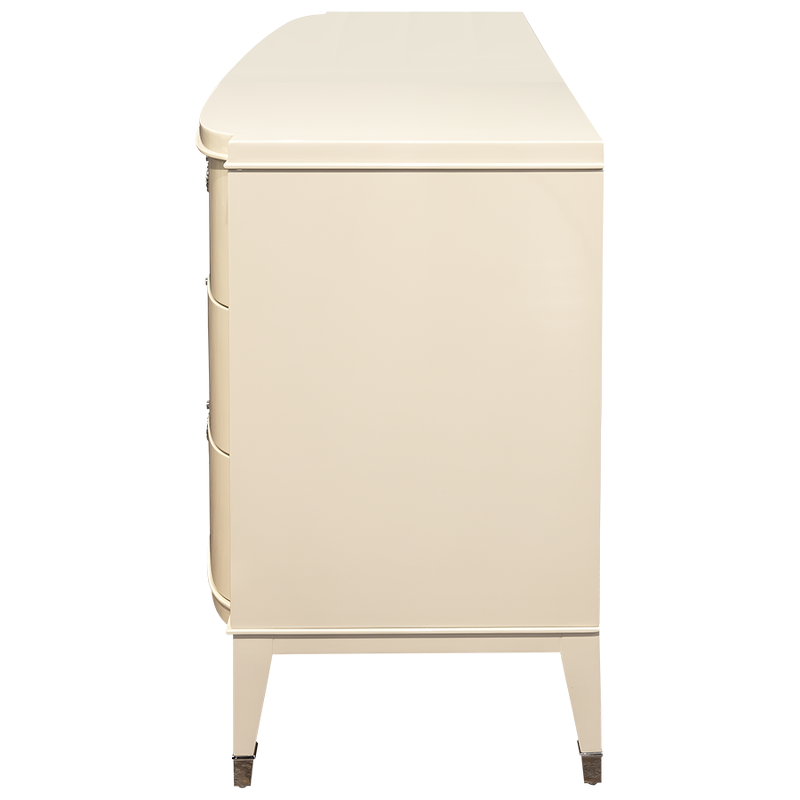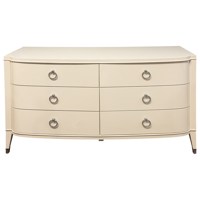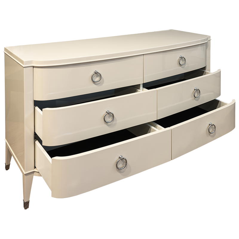 Изящный комод Modena от итальянского бренда Fratelli Barri. Комод в неоклассическом стиле, с 6-ю выдвижными ящиками. Закругленные фасады. Отделка - бежевый блестящий лак. На ножках металлические колпачки. Выполнен из массива дерева и высококачественного МДФ класса Е1. Цвет фурнитуры - хром. Дно ящиков декорировано черной бархатной тканью. Ящики оснащены доводчиками для плавного закрывания.