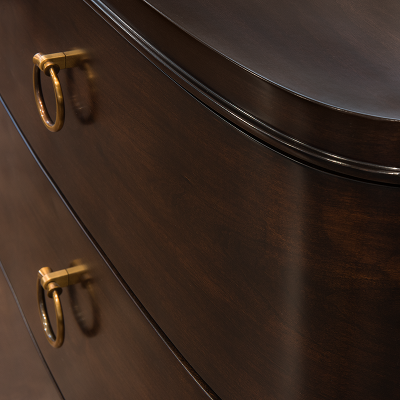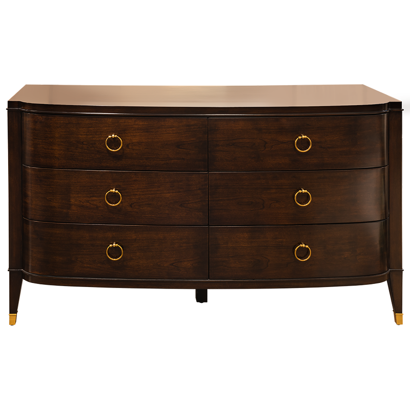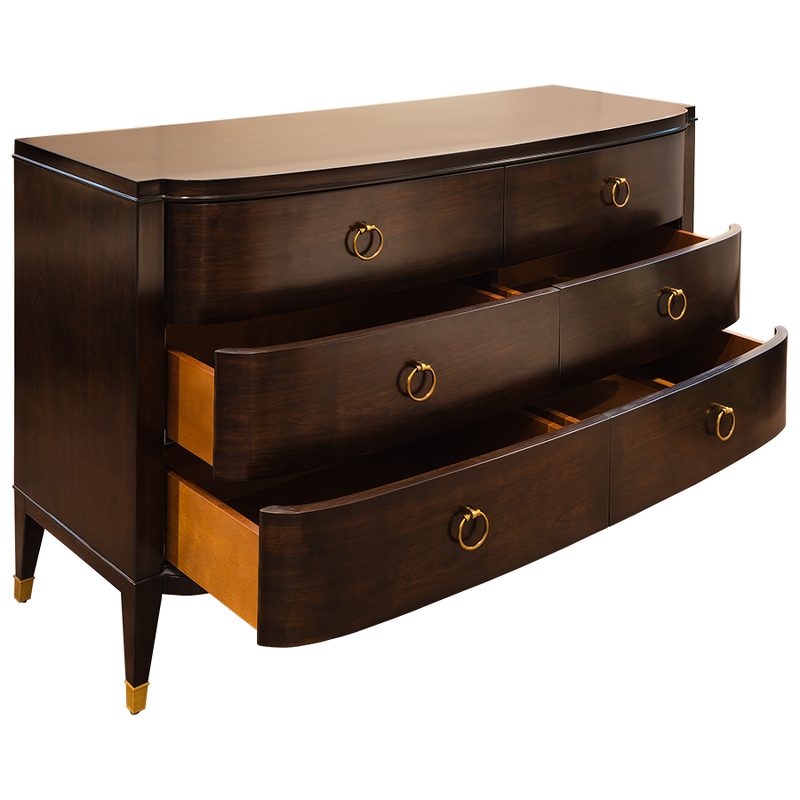 Изящный комод Modena от итальянского бренда Fratelli Barri. Комод в неоклассическом стиле, с 6-ю выдвижными ящиками. Закругленные фасады. Отделка - шпон вишни. На ножках металлические колпачки. Выполнен из массива дерева и высококачественного МДФ класса Е1. Цвет фурнитуры - латунь. Ящики оснащены доводчиками для плавного закрывания.