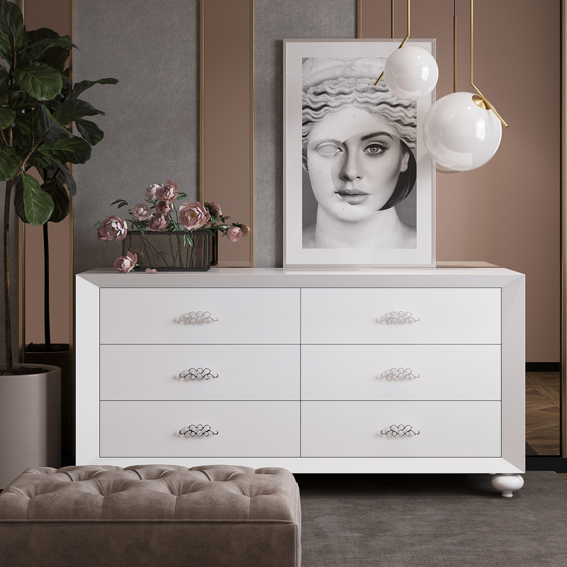 Классический комод прямоугольной формы от итальянских мебельных умельцев ослепляет глянцевой отделкой. Низкие ножки изысканной и оригинальной формы удерживают массивную конструкцию. Сделан из высококачественного МДФ высокой плотности. Отделка белый блестящий лак. 6 выдвижных ящиков оснащены системой плавного закрывания. Ручки изготовлены из хромированного металла. Ножки изготовлены из массива гевеи и полимерной смолы.