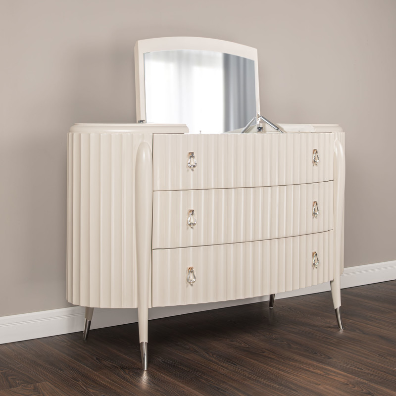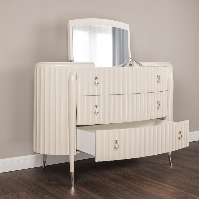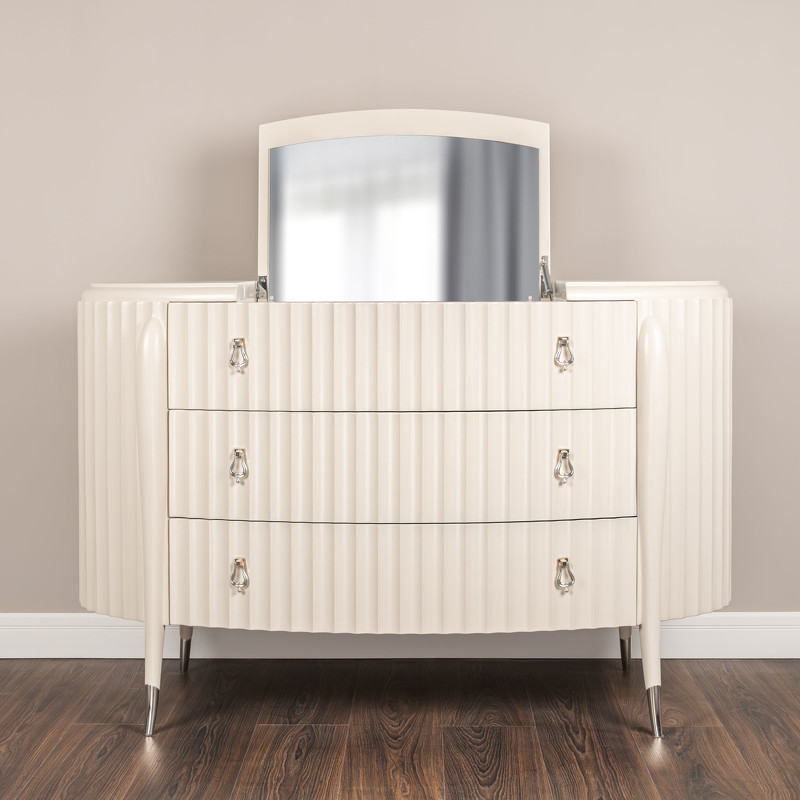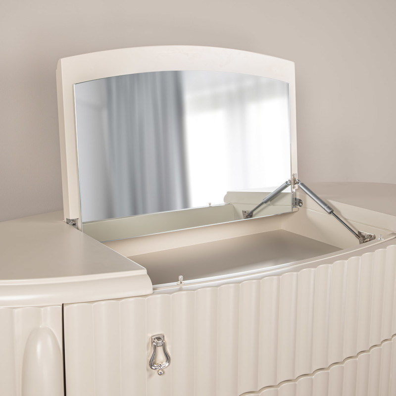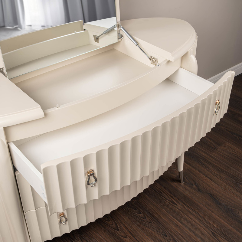 Элегантный комод от итальянского бренда Fratelli Barri на объемных изогнутых ножках и с модным рифленым фасадом. Модель выполнена в стиле неоклассика с оттенком ар-деко. Комод овальной формы. Ножки с металлическими наконечниками. Изготовлен из массива дерева и высококачественной МДФ высокой плотности. Модель оснащена 3 большими ящиками со скрытыми направляющими и дополнительным отделением в столешнице - с подъемной крышкой и зеркалом. Ящики оснащены доводчиками для плавного закрывания. Цвет фурнитуры - хром.