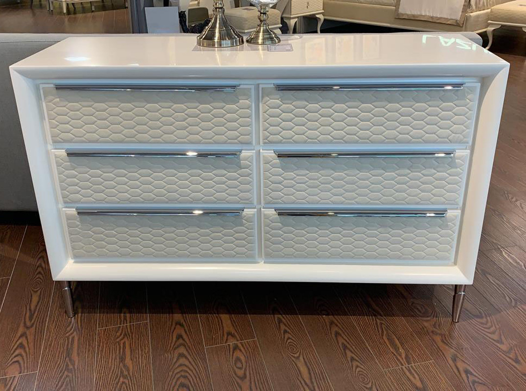 Комод на прямых ножках выполнен в стиле ар-деко из высококачественного МДФ высокой плотности и массива дерева. Оснащен шестью выдвижными ящиками с ручками. Фасады ящиков обтянуты тканью из ассортимента фабрики, декорированы узором.