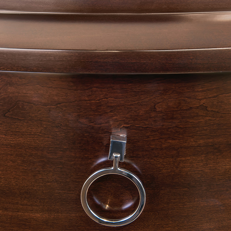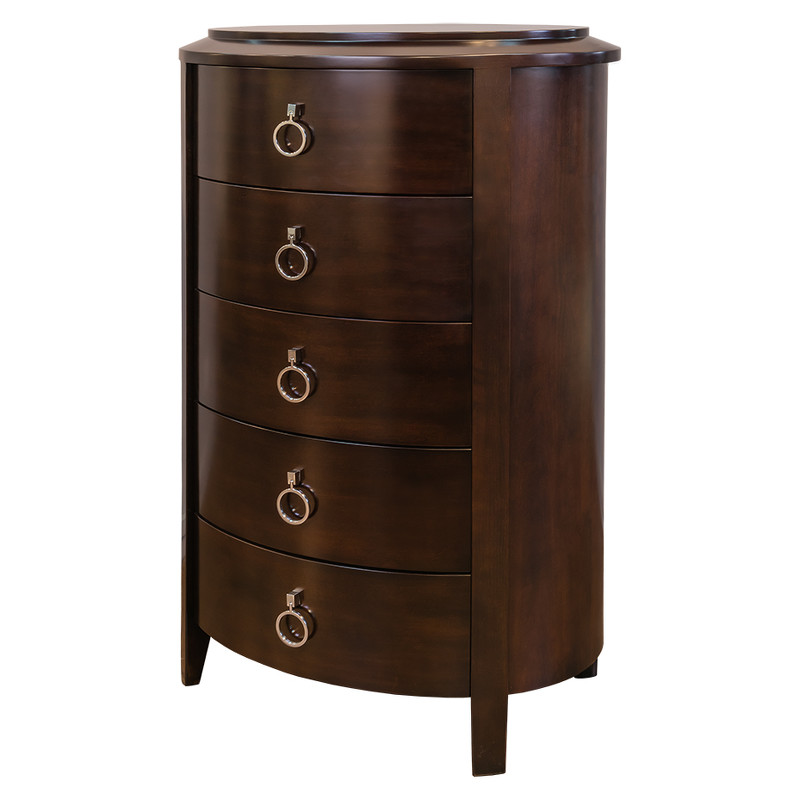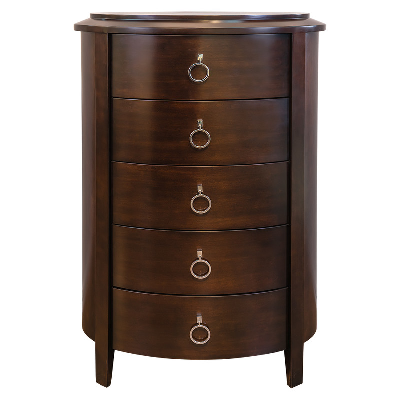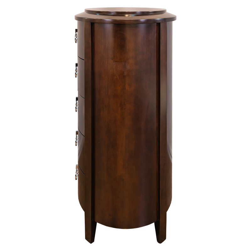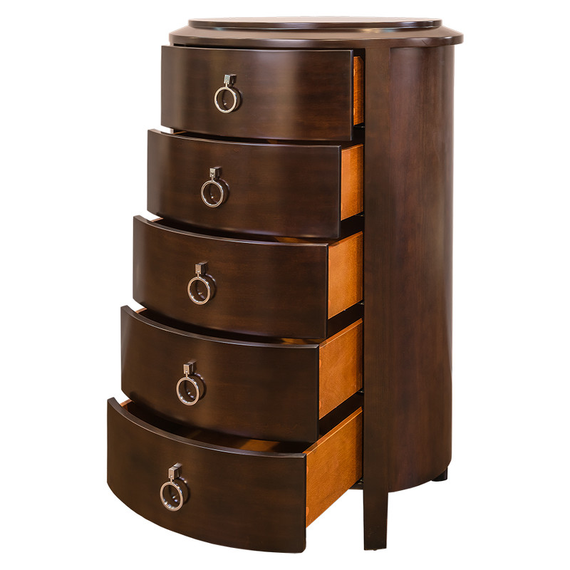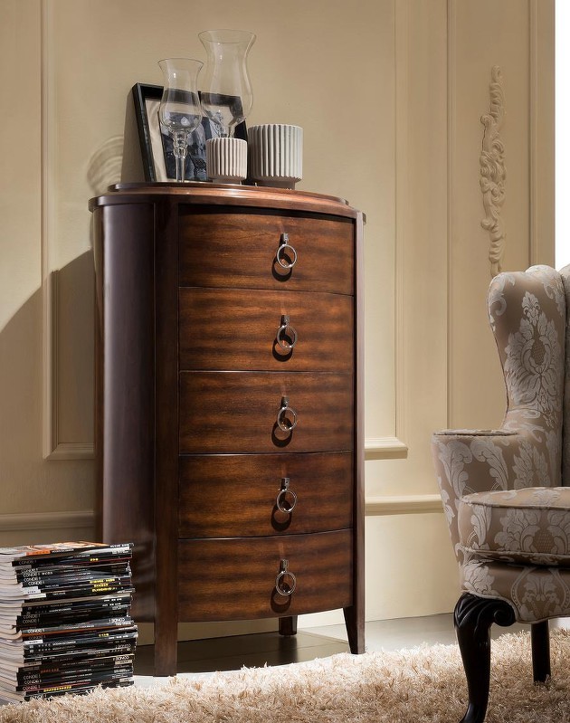 Комод высокий с 5 выдвижными ящиками выполнен в стиле Неоклассика. Отделка шпон вишни. Сделан из массива дерева и высококачественного МДФ высокой плотности. Все выдвижные ящики снабжены направляющими.