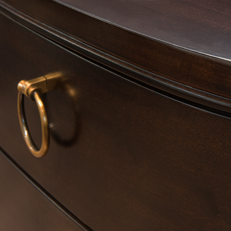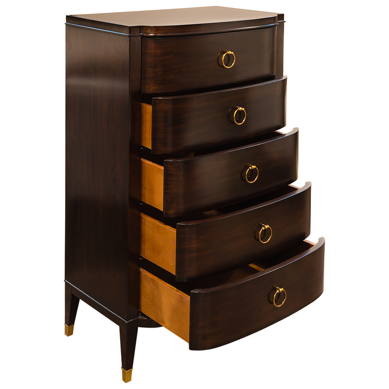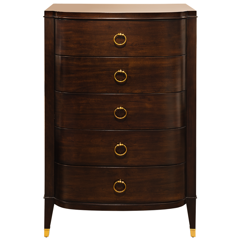 Изящный высокий комод Modena от итальянского бренда Fratelli Barri. Комод в неоклассическом стиле, с 5-ю выдвижными ящиками. Закругленные фасады. Отделка - шпон вишни. На ножках металлические колпачки. Выполнен из массива дерева и высококачественного МДФ класса Е1. Цвет фурнитуры - латунь. Ящики оснащены доводчиками для плавного закрывания.