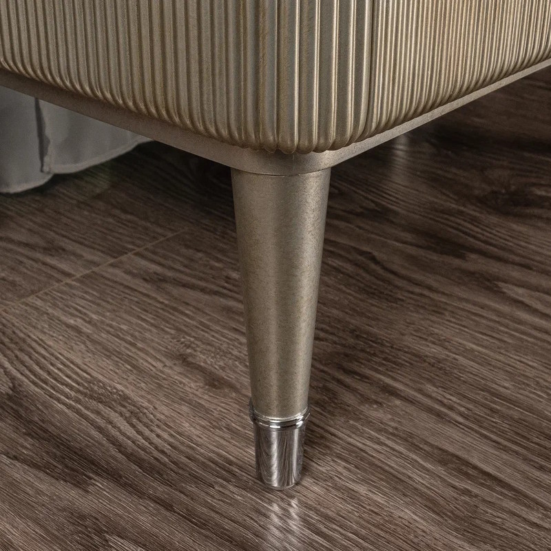 Высокий комод от итальянского бренда Fratelli Barri. Закругленная форма и рифленые фасады выглядят очень актуально. Ножки прямые круглые, зауженные к низу. На ножках металлические колпачки. У комода 5 ящиков. Скрытые направляющие. Ручка - выемка на фасаде. Отделка - лак, цвет - патинированное серебро. Выполнен из массива дерева и высококачественного МДФ класса Е1. Цвет фурнитуры - хром. Ящики оснащены доводчиками для плавного закрывания. Дно ящиков декорировано черной бархатной тканью. Корпус ящиков - белого цвета. Данный предмет является частью коллекции Rimini. Вы можете оформить гостиную, столовую, спальню, кабинет и другие комнаты Вашего дома в едином стиле.