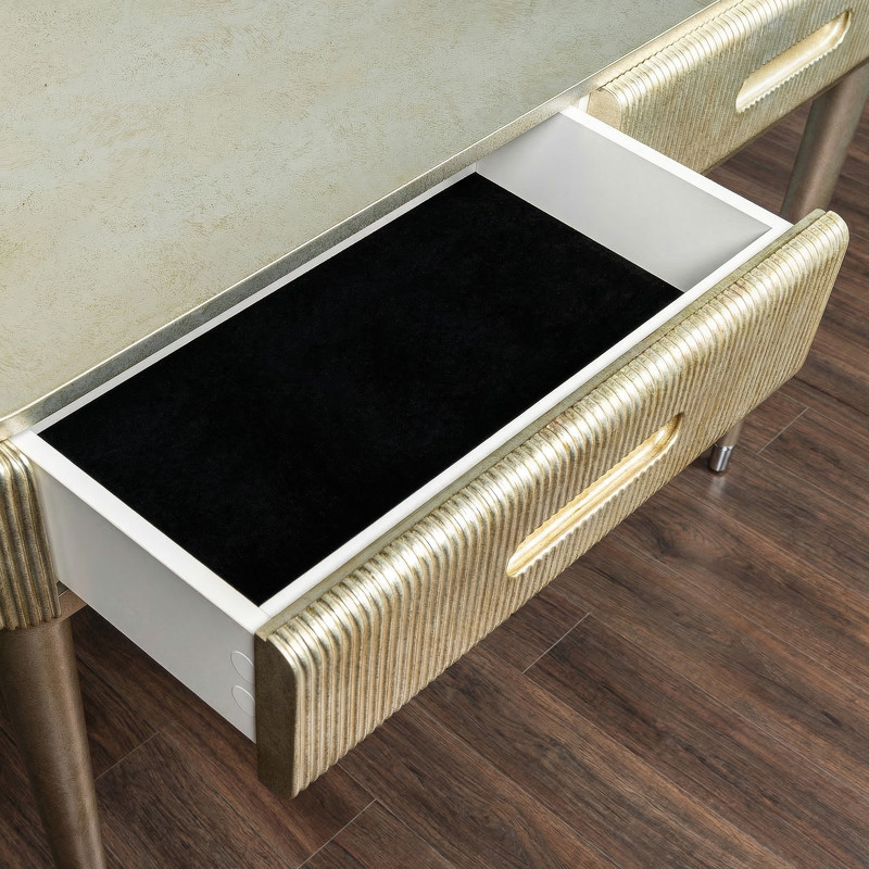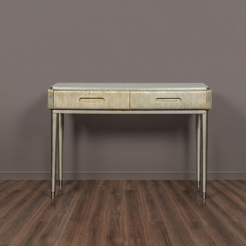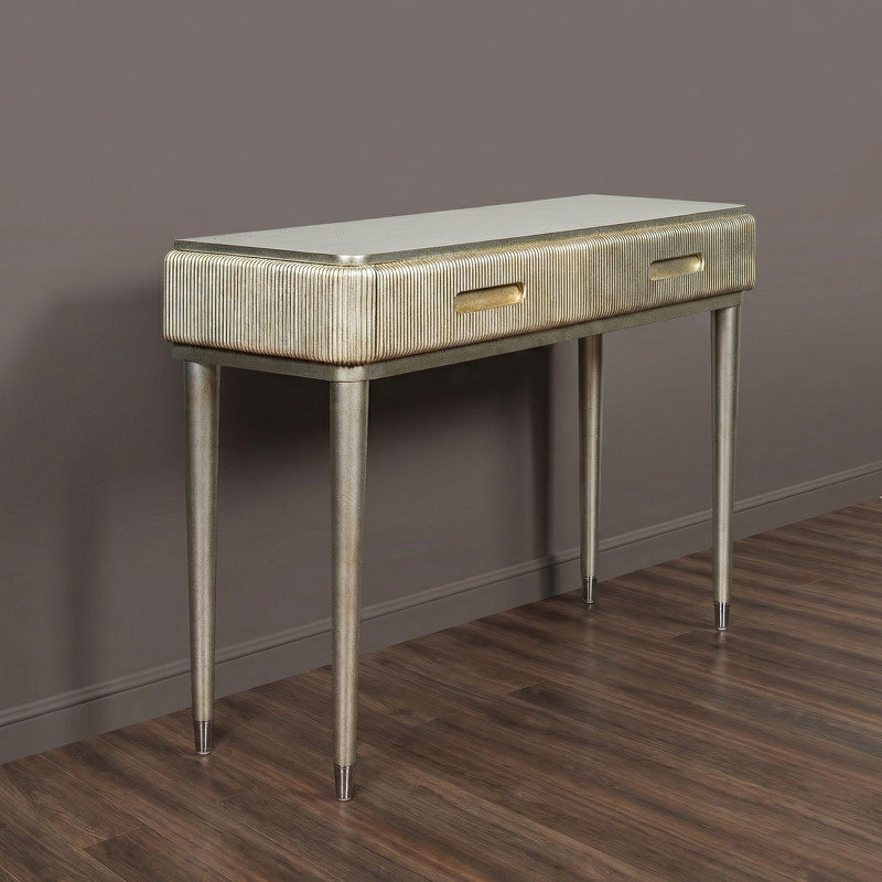 Дизайнерская консоль от итальянского бренда Fratelli Barri. Закругленная форма и рифленые фасады выглядят очень актуально. Ножки прямые круглые, зауженные к низу. На ножках металлические колпачки. У консоли 2 ящика. Ручка - выемка на фасаде. Отделка - лак, цвет - патинированное серебро. Выполнена из массива дерева и высококачественного МДФ класса Е1. Цвет фурнитуры - хром. Ящики оснащены механизмом открывания push-pull. Дно ящиков декорировано черной бархатной тканью. Корпус ящиков - белого цвета. Данный предмет является частью коллекции Rimini. Вы можете оформить гостиную, столовую, спальню, кабинет и другие комнаты Вашего дома в едином стиле.
