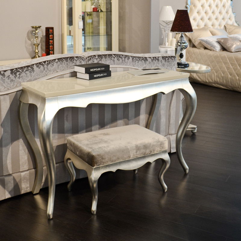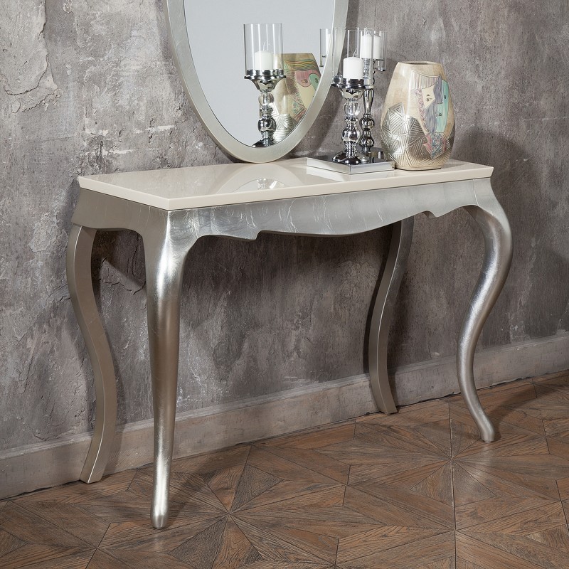 Консоль Venezia выполнена в стиле близком к классическому. Сочетание прямого топа и ножек кабриоль придает мебели этой коллекции особенную привлекательность. Топ выполнен из МДФ класса Е1. Ножки и резное подстолье - из массива дерева. Отделка столешницы - перламутровый кремовый лак. Высокие гнутые ножки в отделке сусальное серебро, покрытое лаком шампань - ручное нанесение.