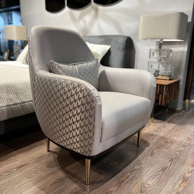 Элегантное кресло, выполненное в стиле ар-деко. Каркас изготовлен из массива бука. Сидение на скрещенных эластичных ремнях, наполнитель пенополиуретан. Ножки металл. В комплектацию входит одна декоративная подушка размером 50*30 см.