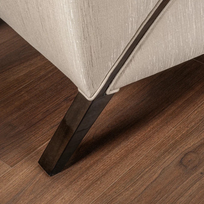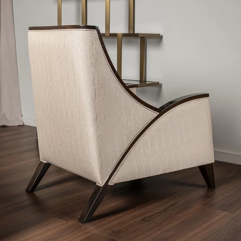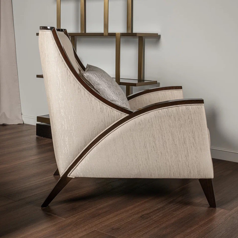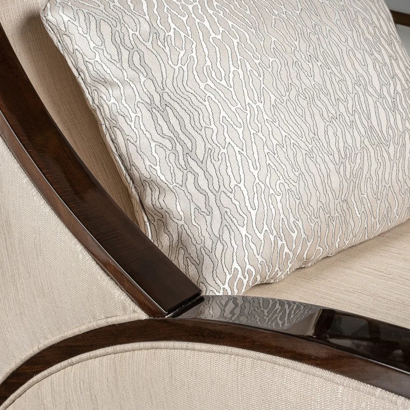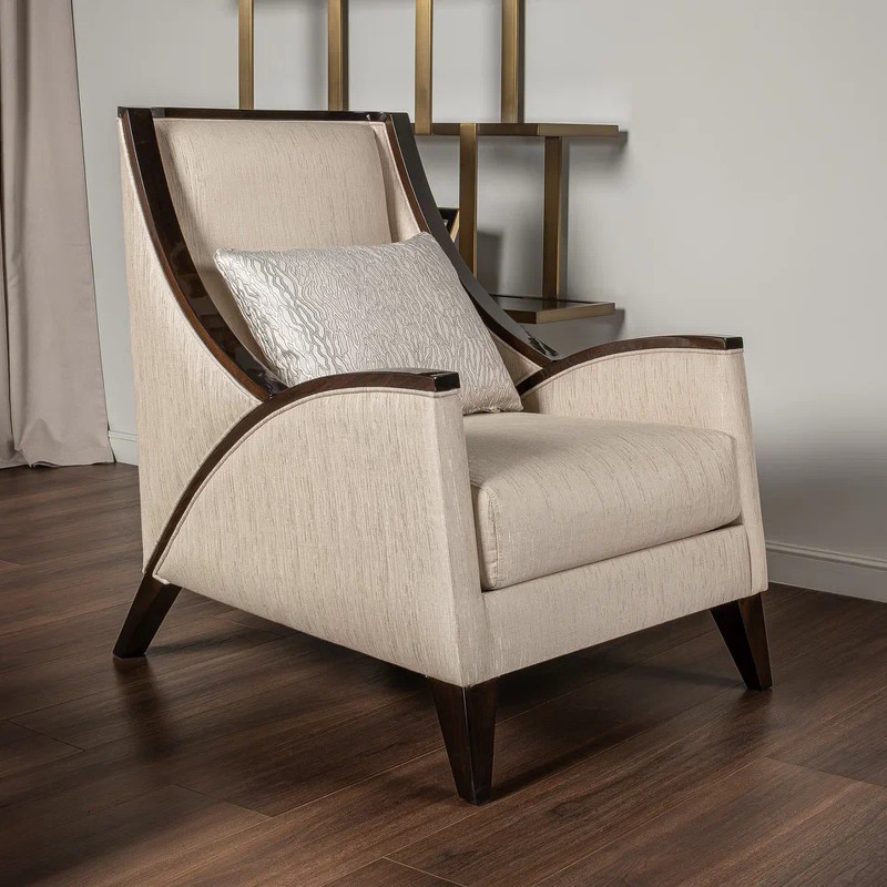 Кресло выполнено в стиле Ар-деко. Каркас изготовлен из массива бука. Наполнитель пенополиуретан, ножки массив бука. Кресло обито тканью из ассортимента фабрики в светло-бежевых тонах. Тип ткани - жаккард. Состав ткани 66% полиэстер, 34% хлопок. В комплекте декоративная подушка размером 40*50 см в ткани в светло-бежевых тонах с акцентным рисунком.