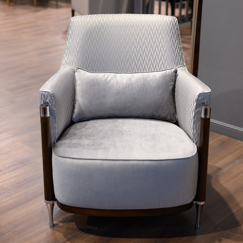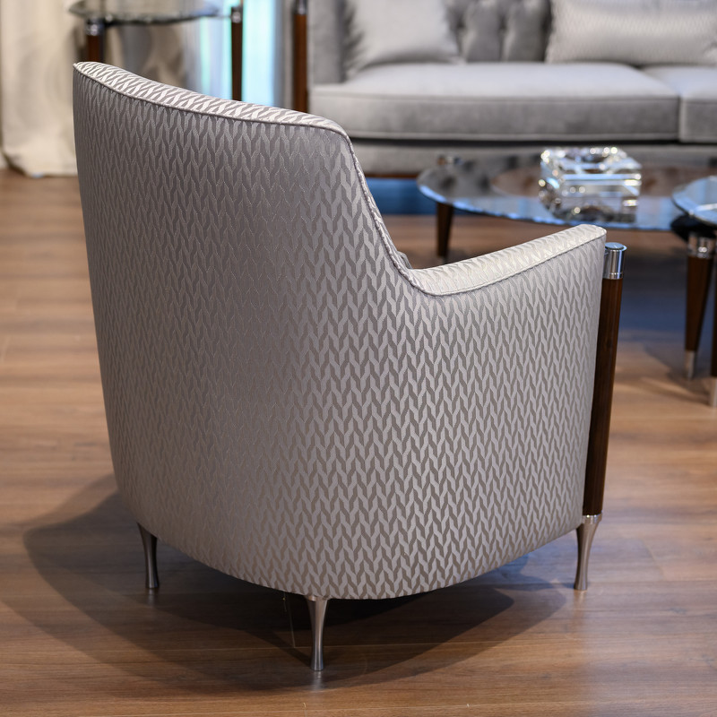 Кресло выполнено в стиле Ар-деко. Каркас изготовлен из массива бука. Сидение на эластичных ремнях, наполнитель пенополиуретан. Детали выполнены из нержавеющей стали с хромированным покрытием и мрамора. В комплектацию входит декоративная подушка размером 50*30 см.