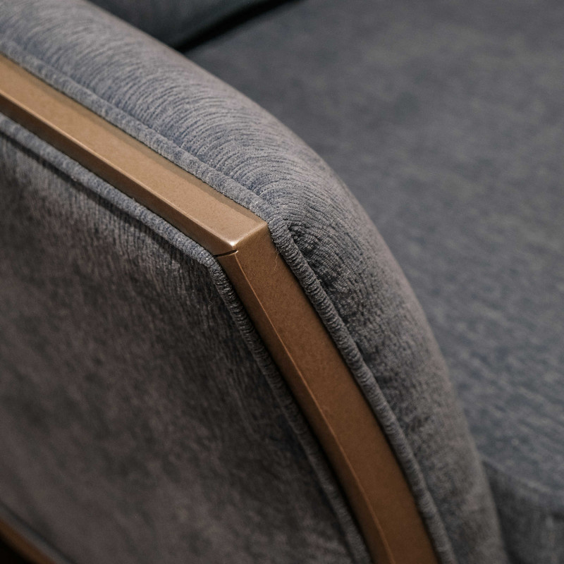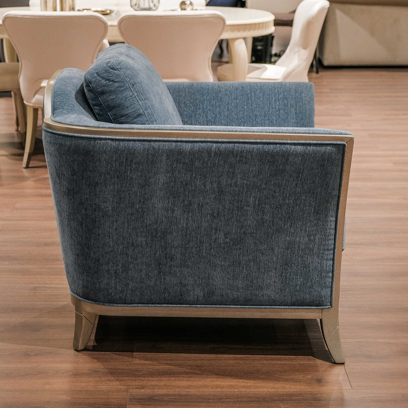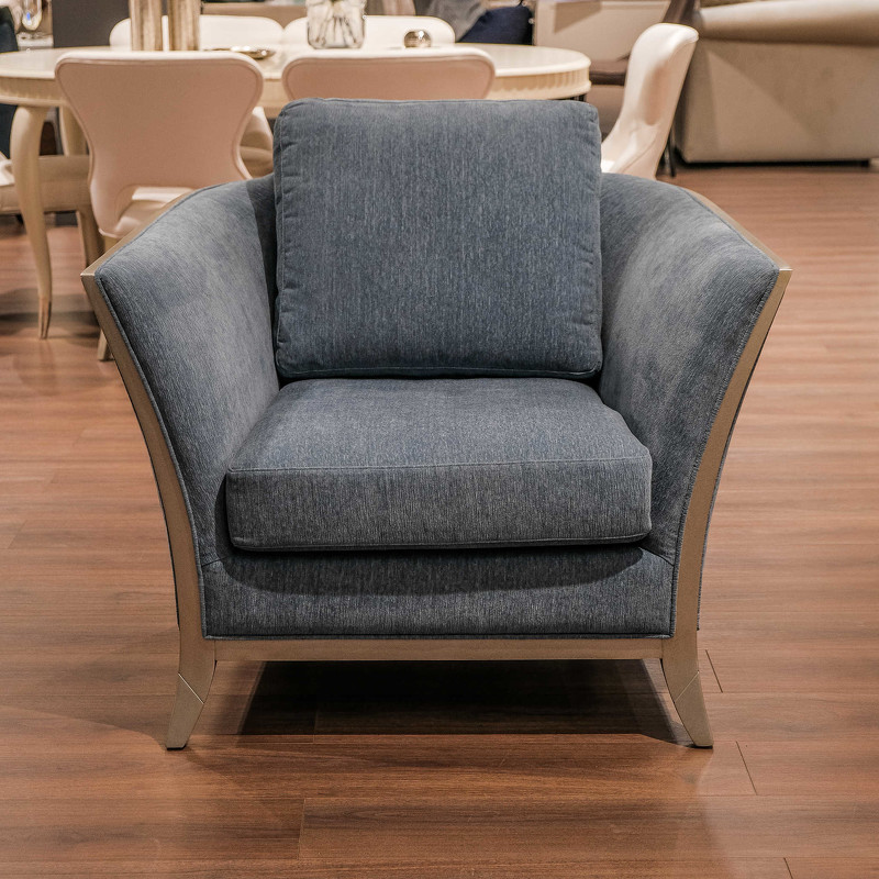 Изящное кресло Modena итальянского бренда Fratelli Barri на низких ножках выполнен в стиле неоклассика. Отделка - патинированное серебро. Обтянут тканью, декорирован кантом в тон основной обивки. Высокие, слегка наклоненные подлокотники подчеркивают оригинальность модели. Выполнено из массива дерева. Обито тканью из ассортимента фабрики в синих тонах. Тип ткани - шенилл. Состав ткани - 100% полиэстер.