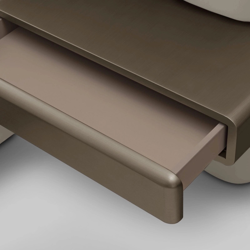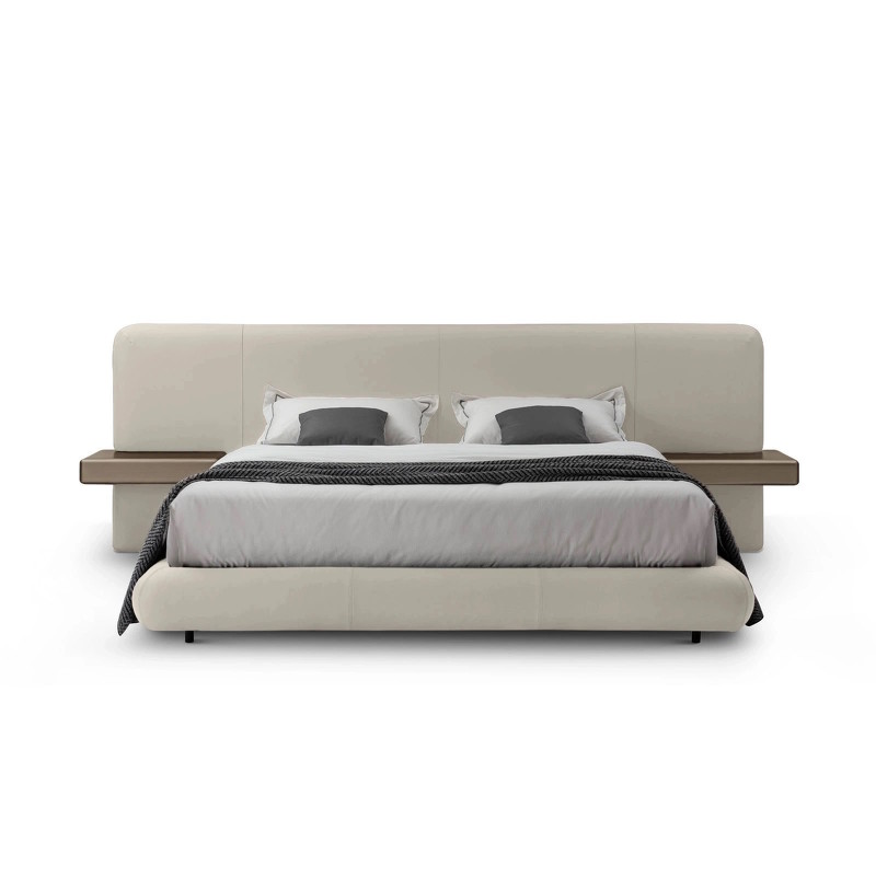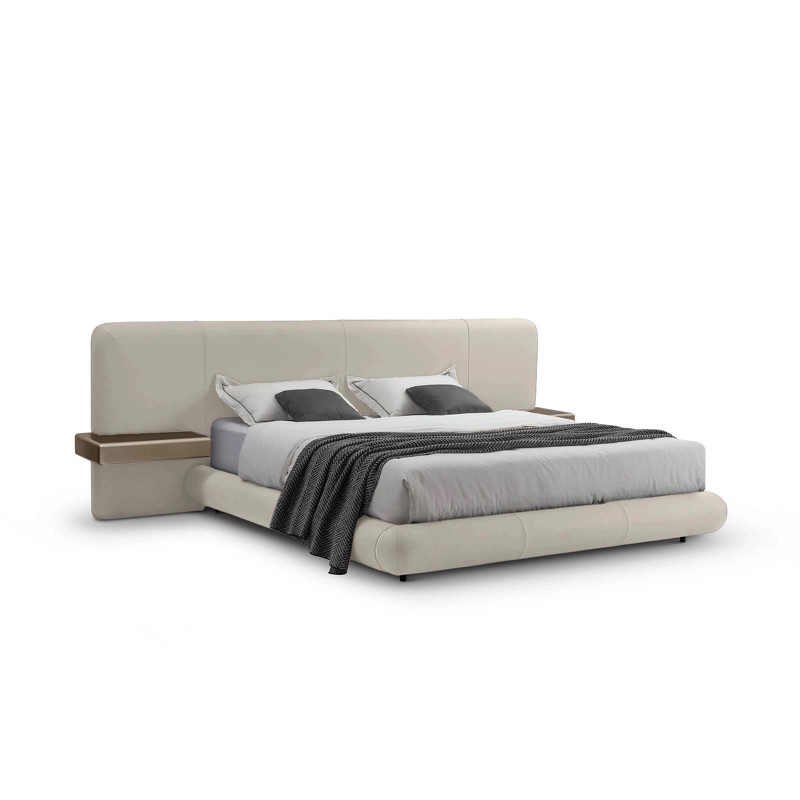Двуспальная кровать с большим мягким изголовьем, оснащенным двумя выдвижными ящиками с каждой стороны, которые играют роль прикроватной тумбы. Размер спального места — 160*200 см. Постельные принадлежности и матрас не входят в комплект.