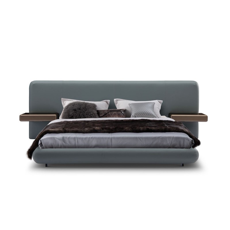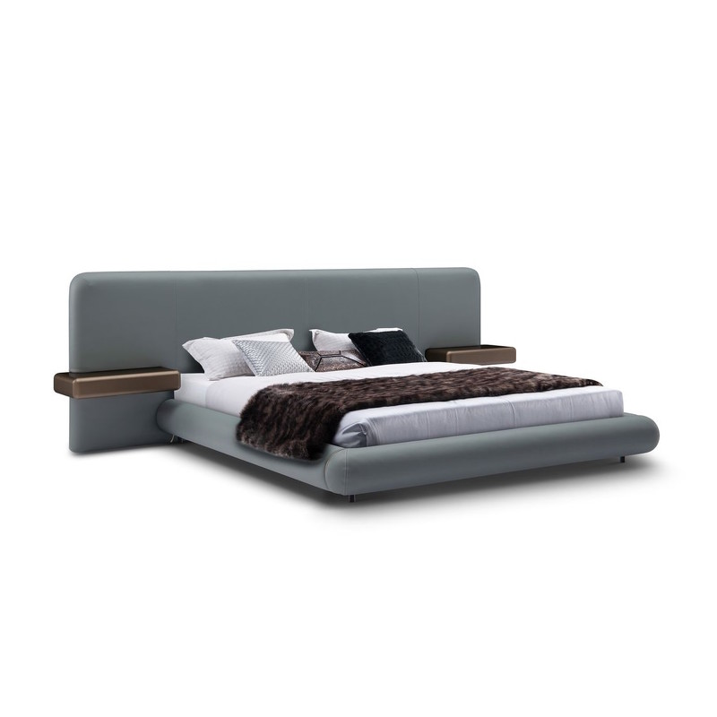Двуспальная кровать с большим мягким изголовьем, оснащенным двумя выдвижными ящиками с каждой стороны, которые играют роль прикроватной тумбы. Размер спального места — 180*200 см. Постельные принадлежности и матрас не входят в комплект.