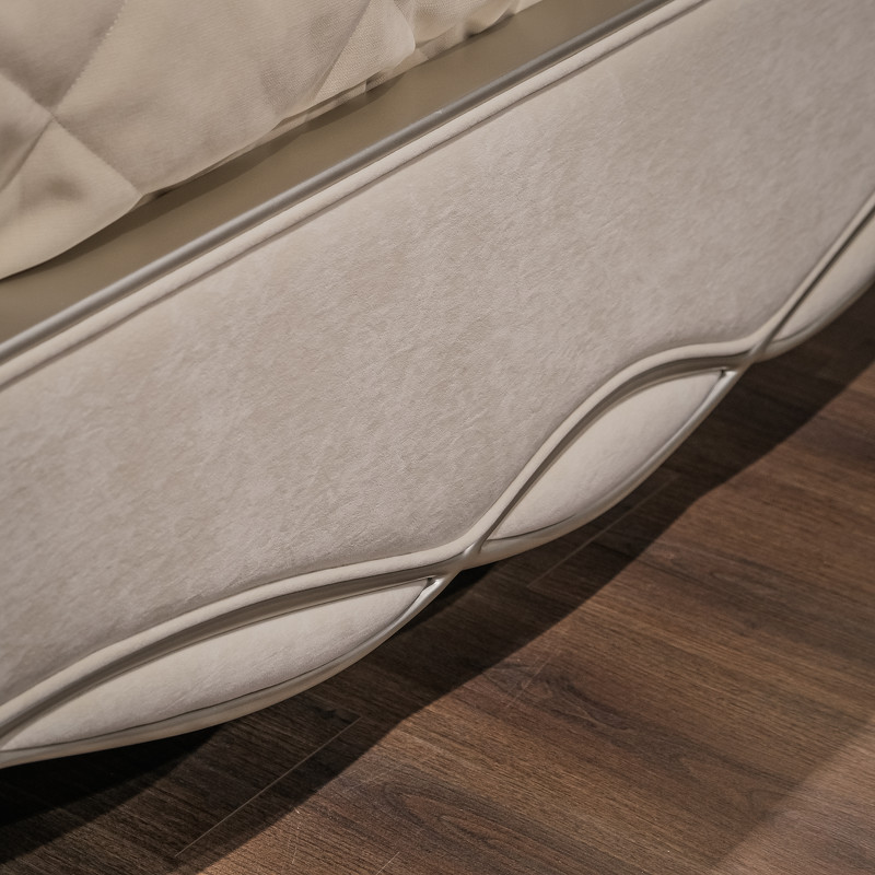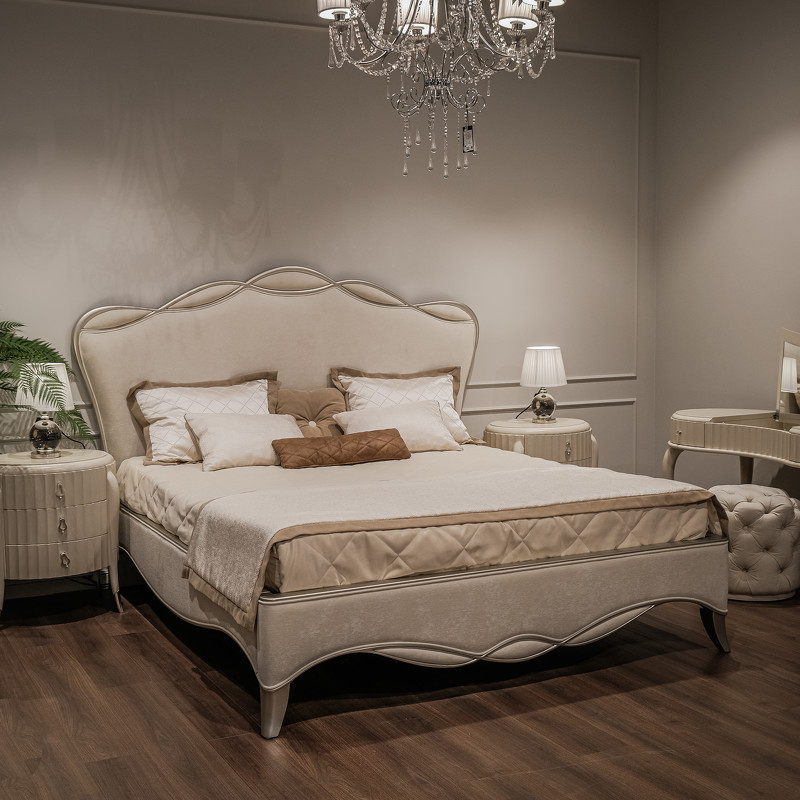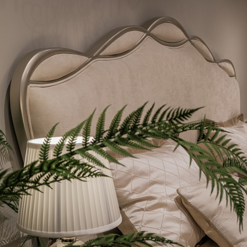 Поистине роскошная модель двуспальной кровати Rimini от итальянского бренда Fratelli Barri. Изголовье сделано вручную из массива дерева и покрыто серебрянным напылением. Фигурные база и ножки добавляют изысканности данной модели. Выполнена кровать из массива дерева и высококачественного МДФ класса Е1. Изголовье и база кровати обтянуты тканью из ассортимента фабрики в белых тонах. Тип ткани - велюр. Состав ткани - 100% полиэстер. Все деревянные части покрыты серебряным напылением. Обратная сторона изголовья обита плотной технической тканью. Кровать прекрасно сочетается с корпусной мебелью из всех коллекций фабрики. Размер спального места — 180*200 см. Кровать поставляется в комплекте с решеткой. Покрывала, подушки и матрас не входят в комплект поставки.