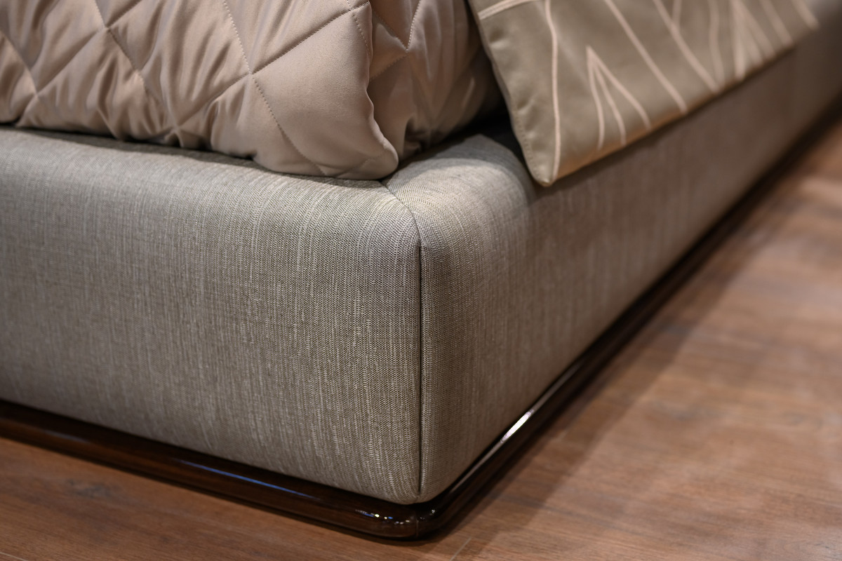 Кровать выполнена в стиле Ар-деко. Мягкое изголовье декорировано вертикальной стежкой. Основание кровати обито тканью из ассортимента фабрики в тон изголовья. Поставляется без матраса и постельных принадлежностей.