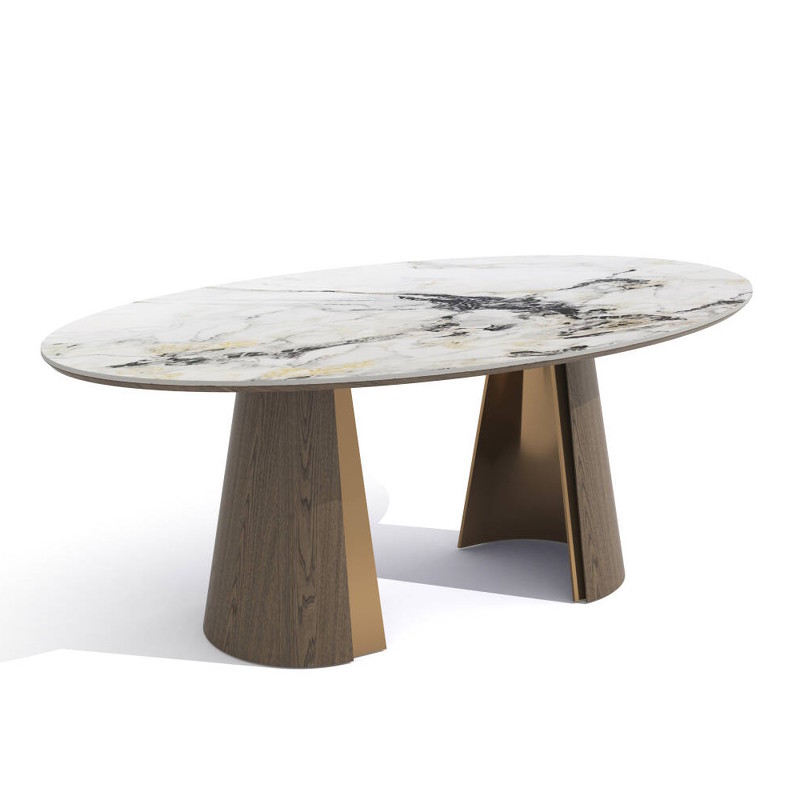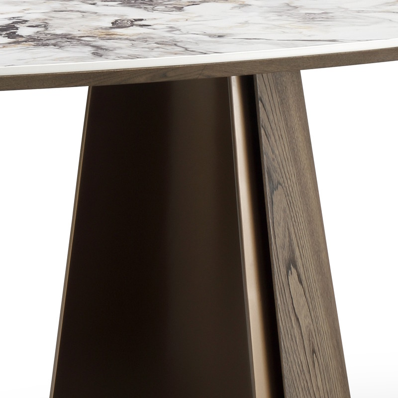 Дизайнерский обеденный стол Belmonte бренда Fratelli Barri. Стол с акцентной овальной керамической столешницей и интересными полукруглыми ножками станет центром современной столовой группы. Овальная форма стола делает его эргономичным и безопасным. А скошенный внутрь стола торец столешницы - элегантным и легким. Вставки на ножках в цвете латунь придают столу дополнительного шика. Столешница изготовлена из керамики в бежевом с прожилками цвете, подстолье и ноги - высококачественный МДФ. Отделка - натуральный шпон вяза, тонированный в теплый коричневый цвет. Стол фиксированный, не раскладной. Стол для комфортного размещения 6-8 человек. Обращаем внимание, что керамическая столешница имеет рисунок под мрамор и всегда неповторима, поэтому рисунок на столешнице может отличаться от фото на сайте.