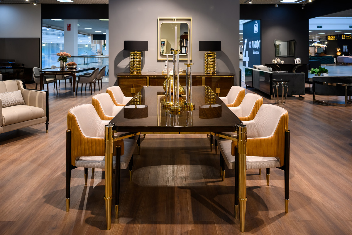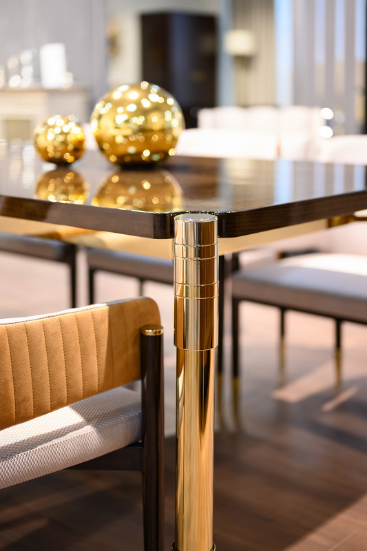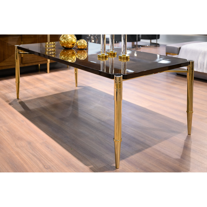 Стильный обеденный стол от бренда Fratelli Barri. Контраст темной столешницы и металлических ног в золотой отделке сделает Ваш интерьер ярким и незабываемым. Изящные ножки конической формы, декорированные несколькими насечками, красивая раскладка шпона на столешнице, сделанная вручную - превращают этот стол поистине в произведение искусства. Столешницы изготовлена из высококачественного МДФ. Ноги - нержавеющая сталь в цвете золото. Отделка - натуральный шпон эвкалипта. тонированный в теплый коричневый цвет, покрытый глянцевым лаком. Эвкалипт - один из самых дорогих видов дерева для изготовления мебели. Рисунок шпона неповторим и каждый предмет в шпоне - это уникальное изделие. Стол фиксированный, не раскладной. Стол для комфортного размещения 8-10 человек.