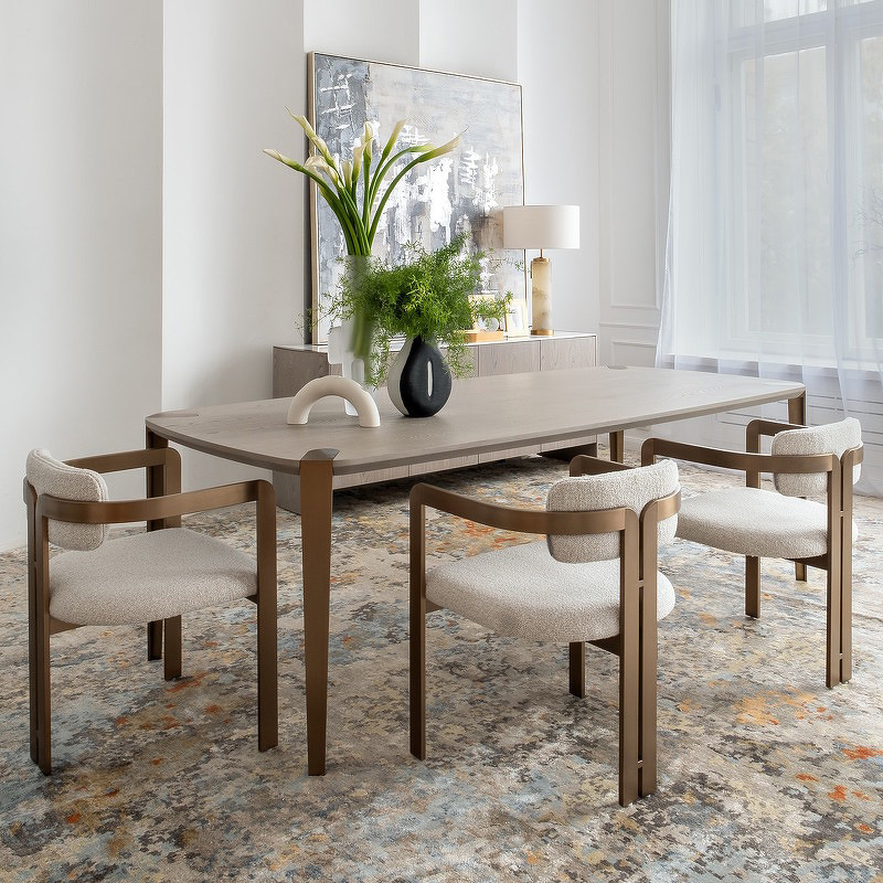 Дизайнерский обеденный стол Noli от бренда Fratelli Barri. Акцентом стола являются "врезанные" в столешницу металлические ноги. Это придает казалось бы простому столу очень интересные детали, привлекающие внимание. Столешница изготовлена из высококачественного МДФ, ножки - МДФ с элементами из матовой нержавеющей стали. Отделка - Натуральный шпон вяза окрашенный в серо-бежевый цвет. Стол фиксированный, не раскладной. Стол для комфортного размещения 8-12 человек.