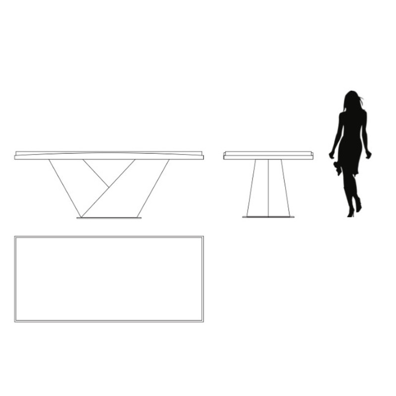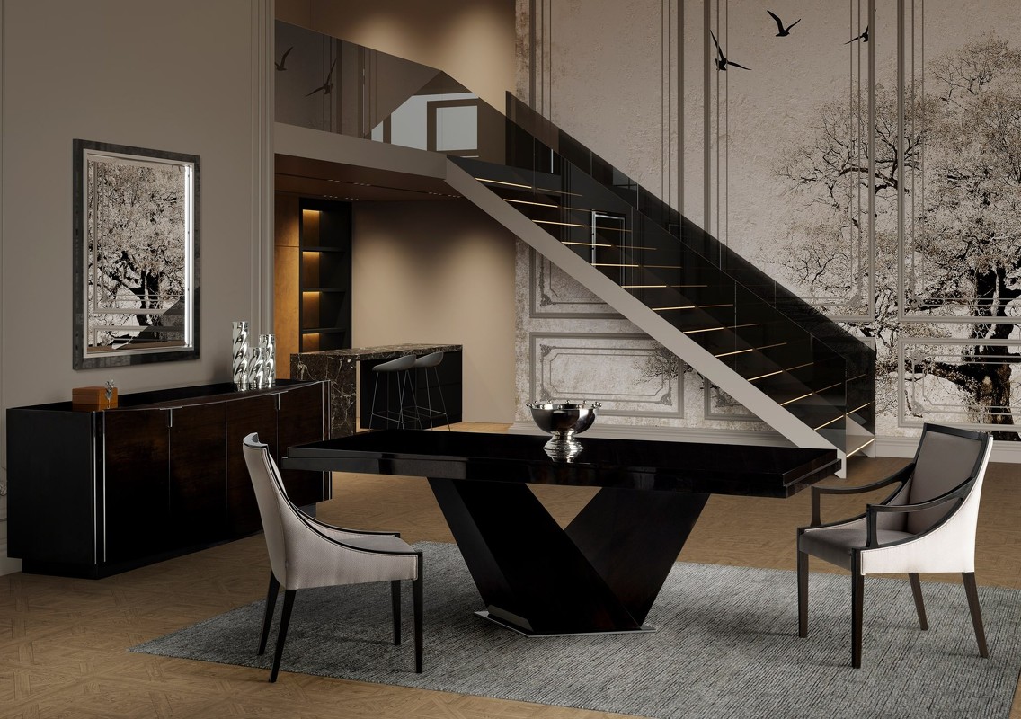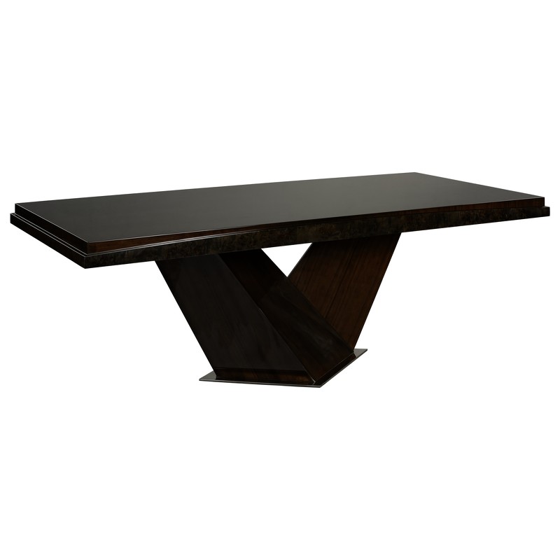Обеденный стол выполнен в стиле ар-деко. Столешница изготовлена из высококачественного шпонированного МДФ высокой плотности. Детали выполнены из полированной стали.