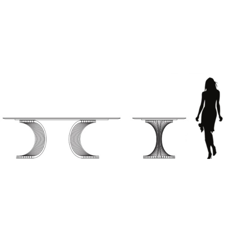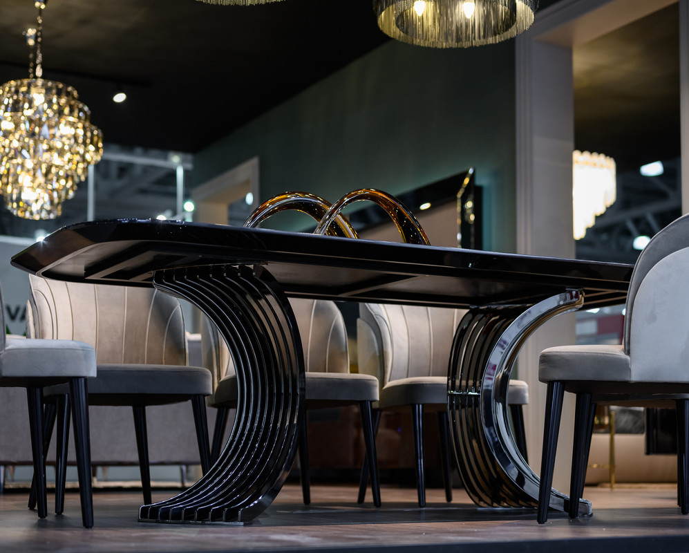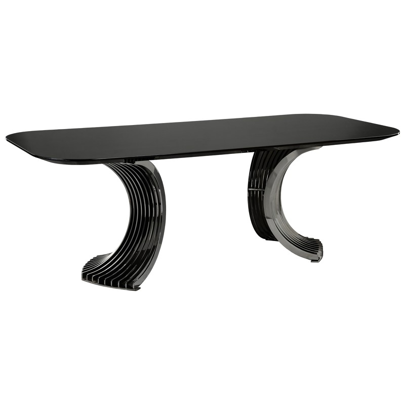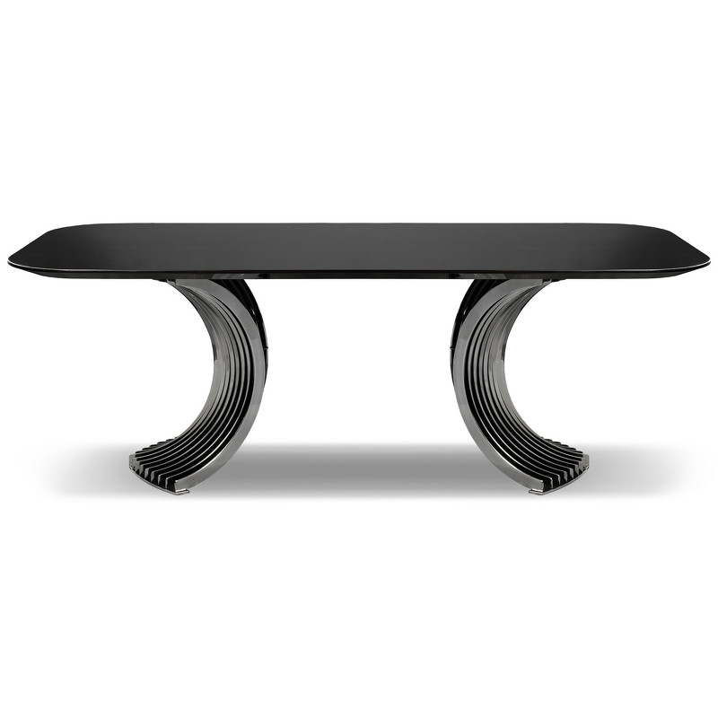 Уникальный дизайнерский обеденный стол от бренда Fratelli Barri в стиле ар-деко. Архитектурные темные блестящие ноги в металле - это поистине главное украшение данного предмета интерьера. Большая столешница в темном цвете со скошенным торцом добавляет изысканности и легкости столу при этом создавая полную гармонию со сложными по дизайну ногами. Столешница изготовлена из высококачественного МДФ. Ноги - нержавеющая сталь в отделке дымчатый хром. Отделка - натуральный шпон ореха, тонированный в темно-коричневый цвет, покрытый глянцевым лаком. Рисунок шпона неповторим и каждый предмет в шпоне - это уникальное изделие. Стол фиксированный, не раскладной. Стол для комфортного размещения 8-10 человек.