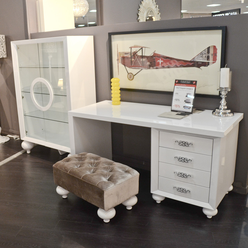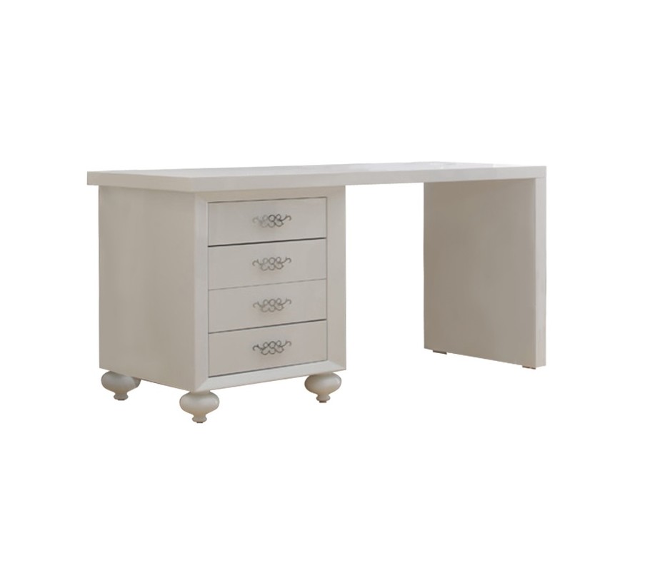 Письменный стол выполнен в стиле Ар деко. Отделка белый блестящий лак. Функционал дополнен тумбой с 4 выдвижными ящиками. Оригинальность модели придают изящные ажурные ручки ящиков. Стол может собираться как справа налево, так и слева направо. Сделан из высококачественного МДФ высокой плотности. Все выдвижные ящики снабжены направляющими.