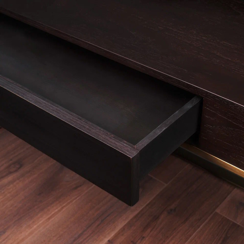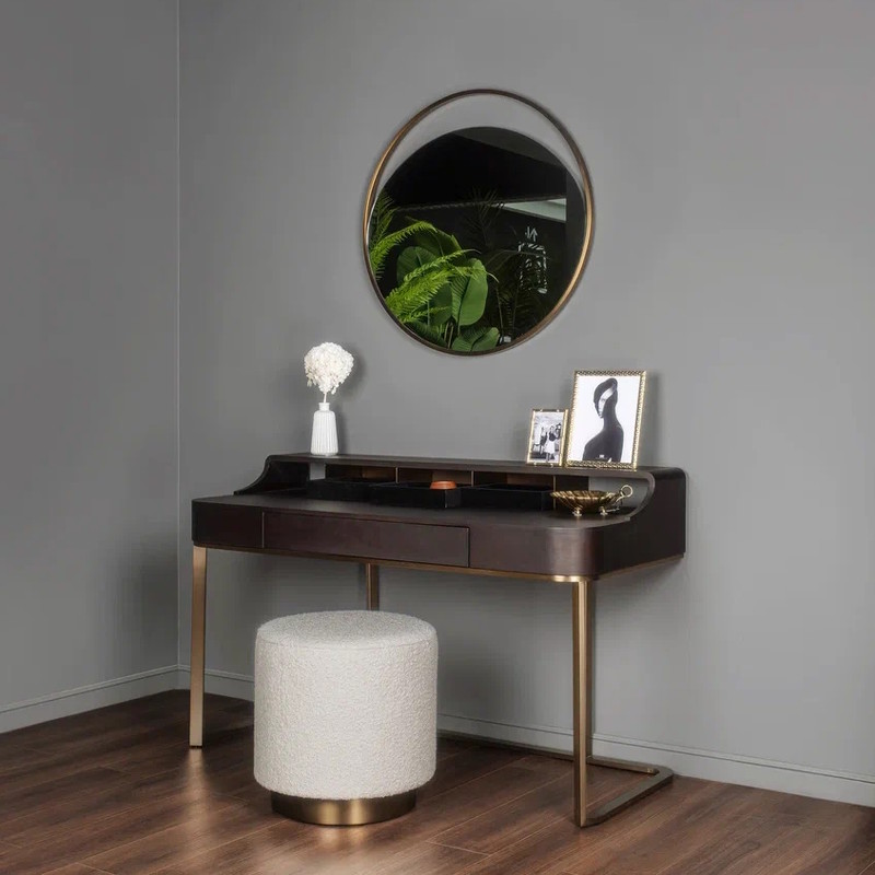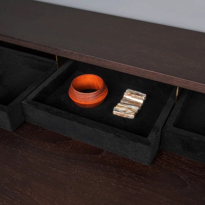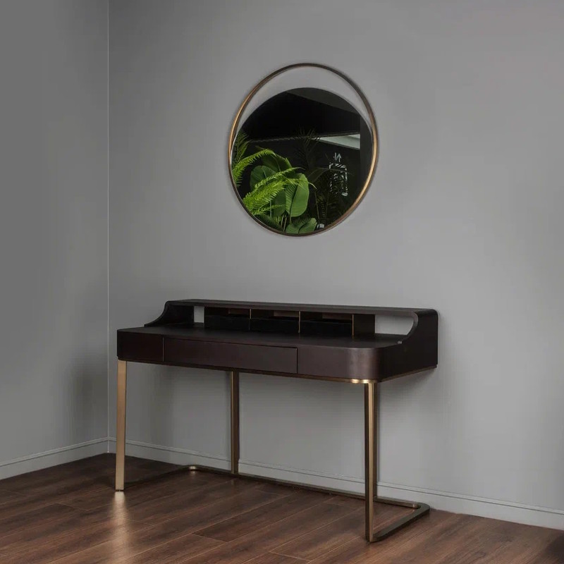 Дизайнерский письменный стол от бренда Fratelli Barri. Элегантный и легкий он впишется в любой интерьер в современном стиле. Стол выполнен из высококачественного МДФ высокой плотности. Отделка - натуральный шпон ореха тонированный в цвет горького шоколада. Металлическая структура - нержавеющая сталь в цвете латунь. Три маленьких ящика для мелочей обтянуты черной бархатной тканью. Ящик стола оснащен скрытыми направляющими. Маленькие ящички для мелочей на столешнице - без направляющих, не зафиксированы.