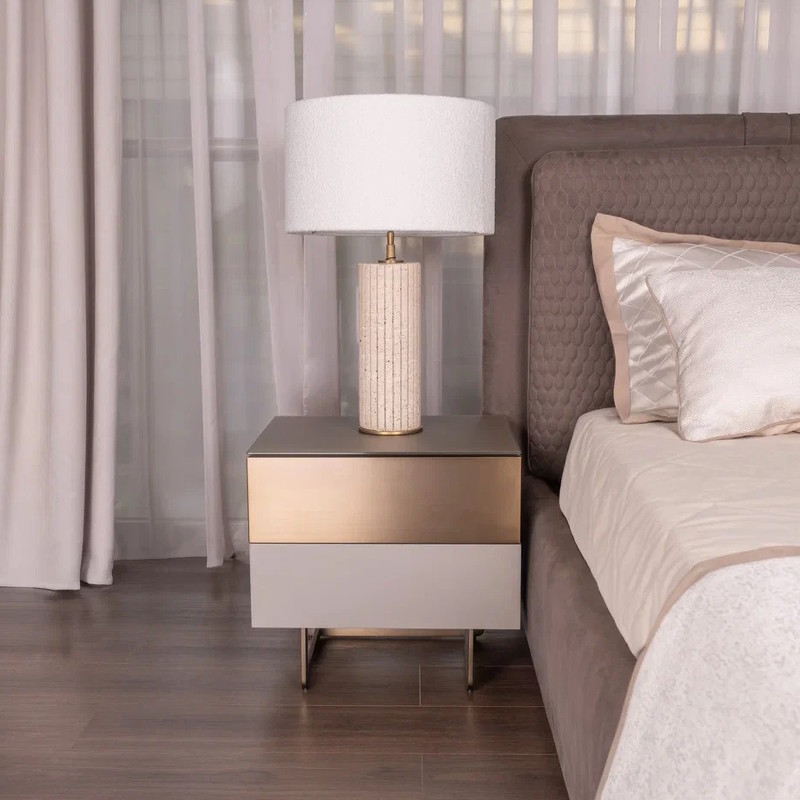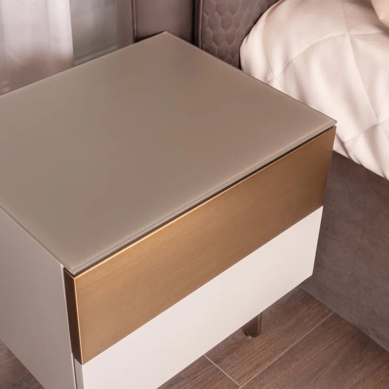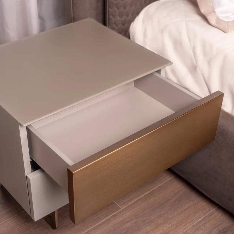 Представляем Вам прикроватную тумбочку FARINI в современном стиле, которая станет не только функциональным элементом Вашего интерьера, но и настоящим произведением искусства. Эта тумбочка, выполненная в элегантном сером матовом лаке, привнесет в Вашу спальню атмосферу утонченности и стиля. С двумя вместительными ящиками, оснащенными скрытыми направляющими и инновационной системой push-to-open, Вы сможете легко и удобно хранить все необходимые мелочи под рукой. Забудьте о ручках — просто легкое нажатие, и ящик откроется, что делает использование тумбочки максимально комфортным. Особое внимание стоит уделить верхнему ящику, фасад которого выполнен в акцентном металле цвета латунь. Этот элемент добавляет изысканности и яркости, подчеркивая индивидуальность Вашего стиля. Ноги из металла в цвете латунь не только придают тумбочке устойчивость, но и становятся стильным акцентом, который гармонично сочетается с общим дизайном. Столешница из матированного стекла добавляет нотку современности и легкости, а также легко очищается от загрязнений, что делает эту тумбочку идеальным выбором для повседневного использования. Не упустите возможность преобразить свою спальню с помощью этой стильной и практичной прикроватной тумбочки. Создайте пространство, в котором будет приятно отдыхать и восстанавливать силы! Под заказ можно менять размер и отделку тумбочки.