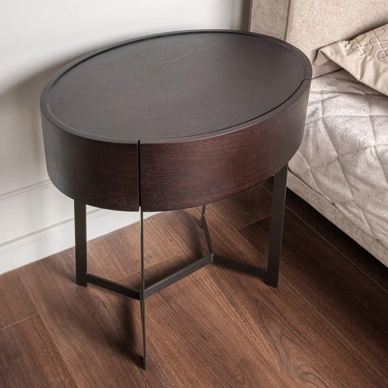 Прикроватная тумбочка от итальянского бренда Fratelli Barri оснащена одним выдвижным ящиком. Корпус и столешница тумбы выполнены в отделке дымчатым шпоном ореха, основание металлическое с долговечным черным порошковым покрытием.
