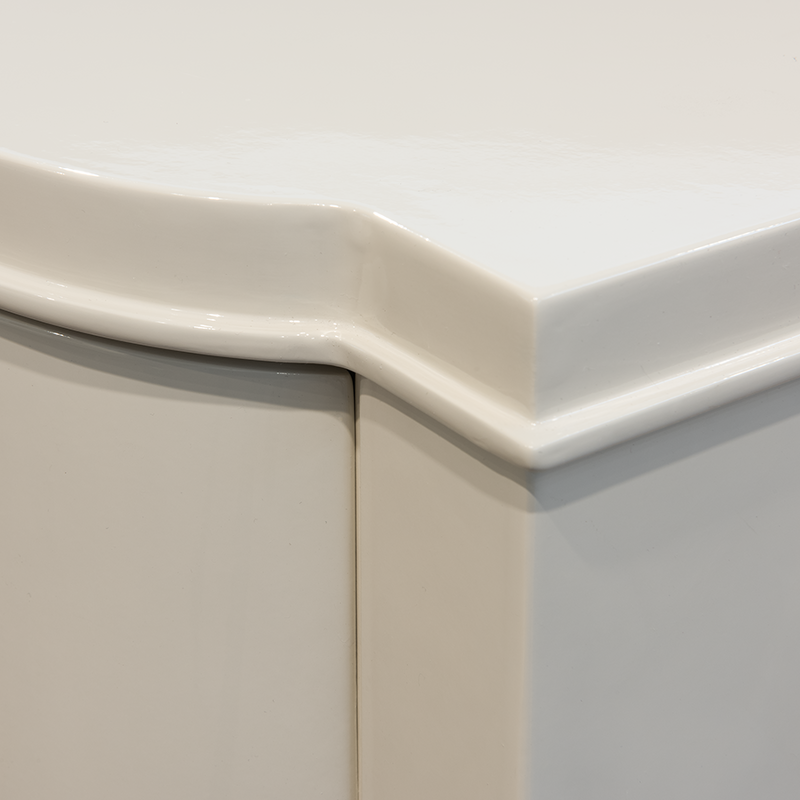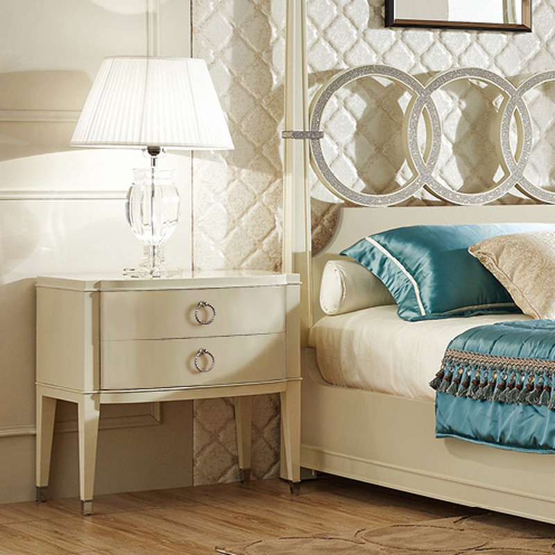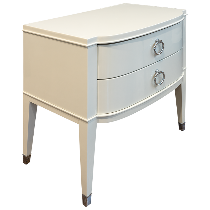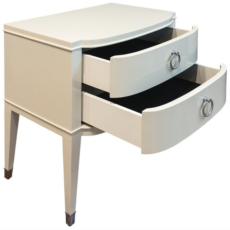 Изящная прикроватная тумбочка Modena от итальянского бренда Fratelli Barri. Тумбочка в неоклассическом стиле, с двумя выдвижными ящиками. Закругленные фасады. Отделка - бежевый блестящий лак. На ножках металлические колпачки. Выполнена из массива дерева и высококачественного МДФ класса Е1. Цвет фурнитуры - хром. Дно ящиков декорировано черной бархатной тканью. Ящики оснащены доводчиками для плавного закрывания. В данной коллекции есть более узкая тумбочка шириной 50 см.
