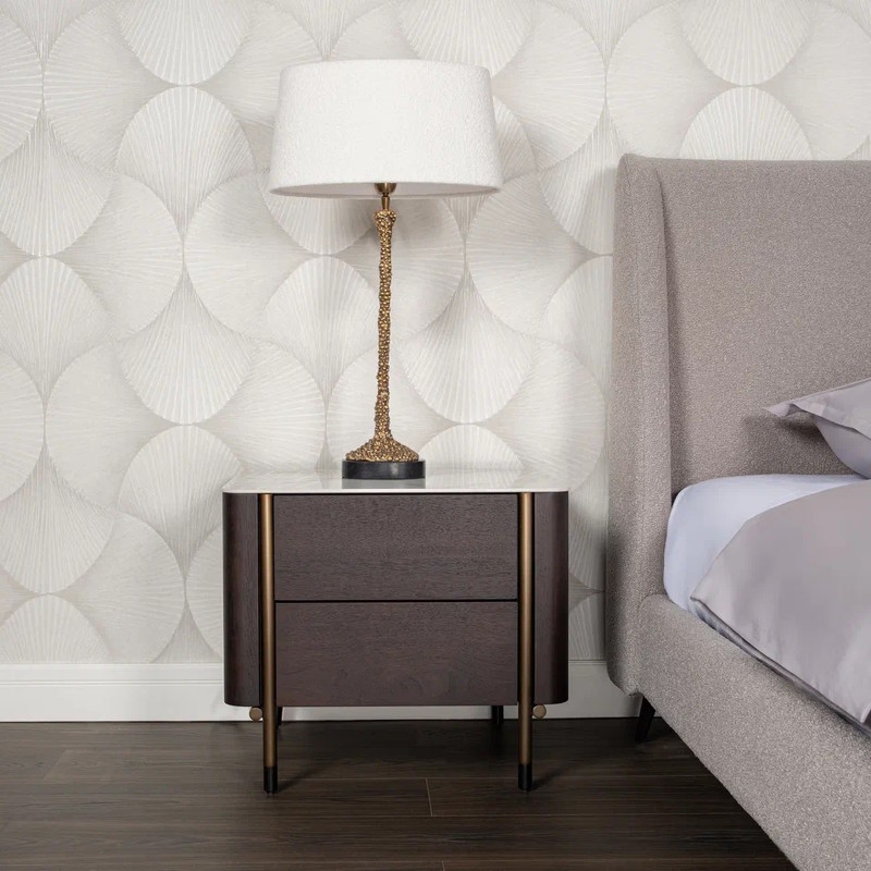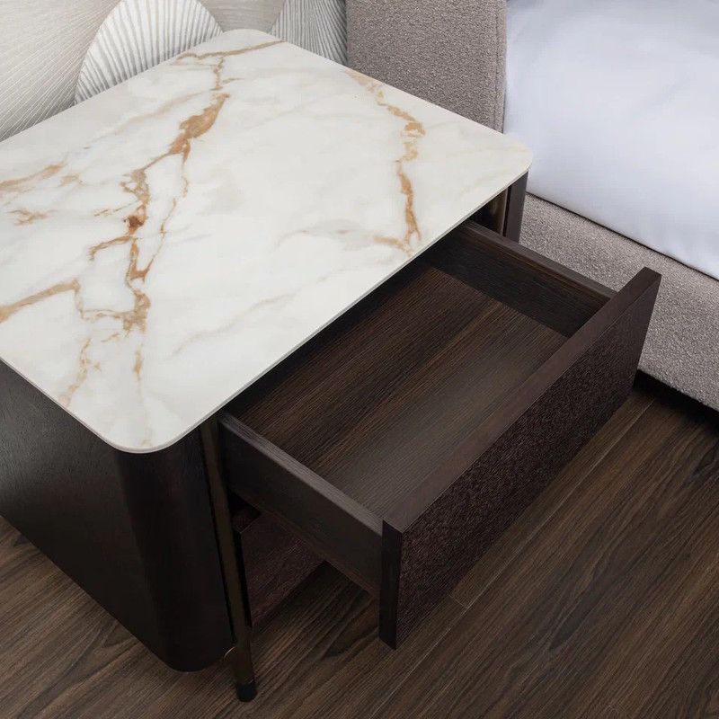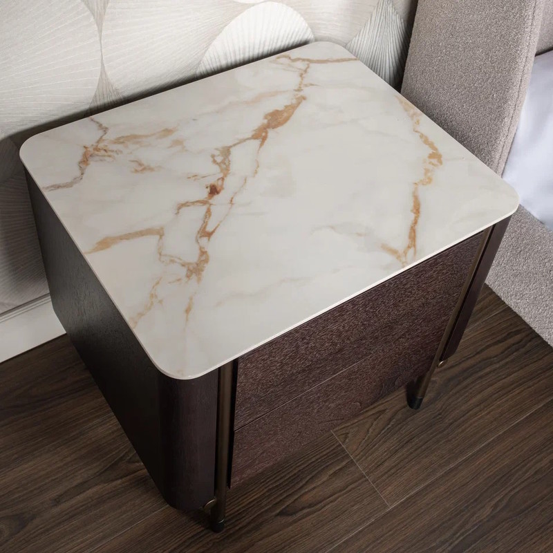 Прикроватная тумбочка от итальянского бренда Fratelli Barri оснащена двумя выдвижными ящиками, благодаря которым можно обеспечить удобное хранение. Ящики оснащены механизмом "push to open". Стеклокерамика имеет индивидуальный рисунок, разной степены насыщенности цвета и "мраморных жил".