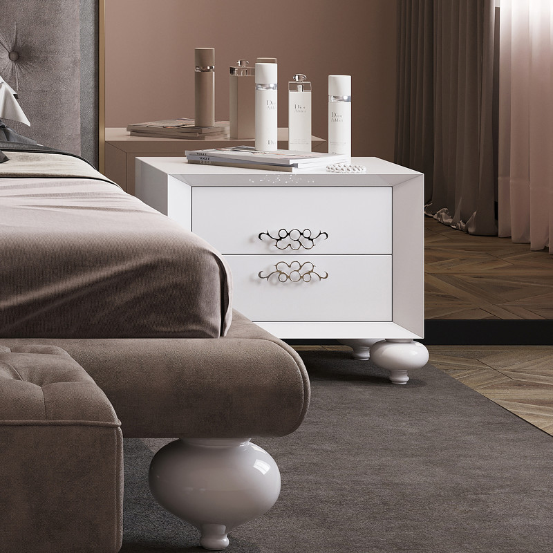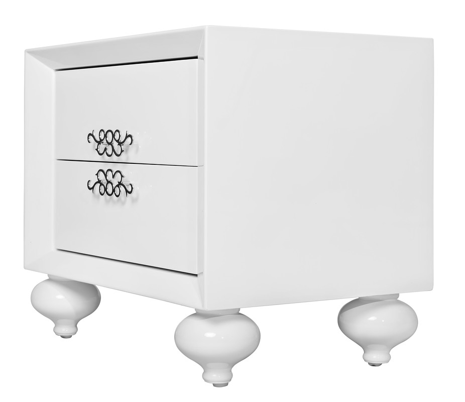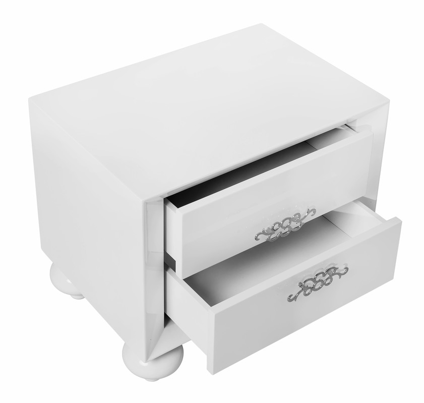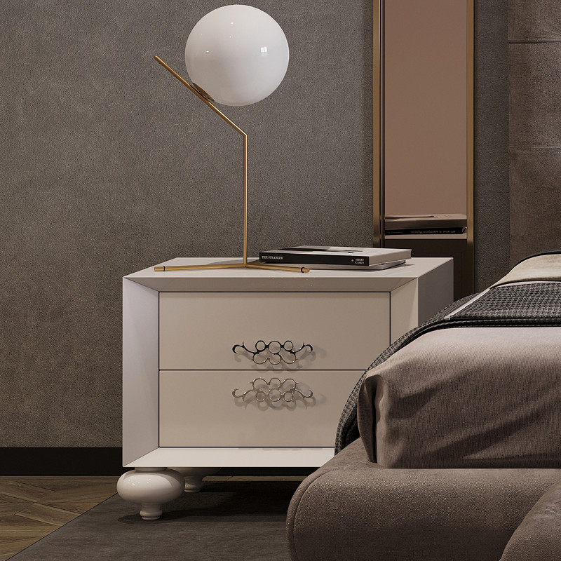 Прикроватная тумбочка выполнена в стиле Ар-деко. Красивая элитная мебель от лучших производителей сделает интерьер спальни по-настоящему роскошным. Прикроватная тумбочка станет украшением спальни. Оснащена двумя выдвижными ящиками. Система плавного закрывания делает ящички более удобными в обращении. Опирается на небольшие ножки красивой необычной формы. Ручки из хромированного металла. Сделана из высококачественного МДФ высокой плотности и массива дерева. Ручки изготовлены из хромированного металла. Ножки из массива гевеи и полимерной смолы