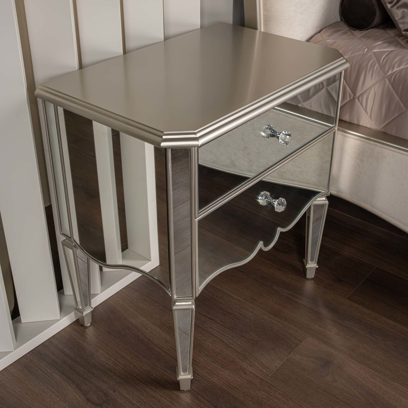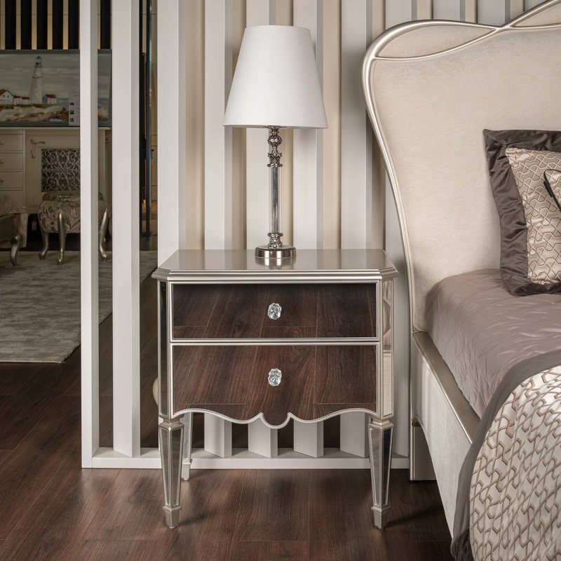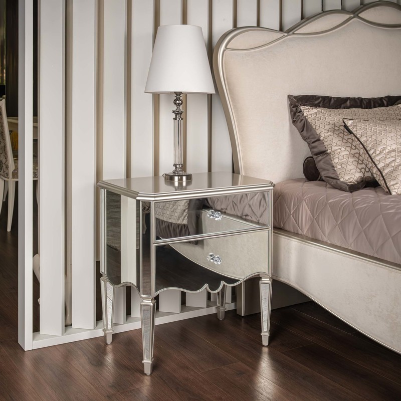 Роскошная прикроватная тумбочка от итальянского бренда Fratelli Barri с зеркальной отделкой в венецианском стиле. Классический стиль в современных материалах смотрится вне времени и всегда будет актуален. Столешница покрыта лаком, цвет - серебряное напыление. Боковые поверхности, фасады и ножки декорированы зеркалами. На ножках металлические колпачки. 2 выдвижных ящика с направляющими скрытого типа. Направляющие с доводчиками для плавного закрывания. Изготовлена из массива дерева и высококачественного МДФ. Цвет фурнитуры - хром. Корпус ящиков бежевого цвета. Данный предмет является частью коллекции Rimini. В этом дизайне есть также комод с 6 ящиками.